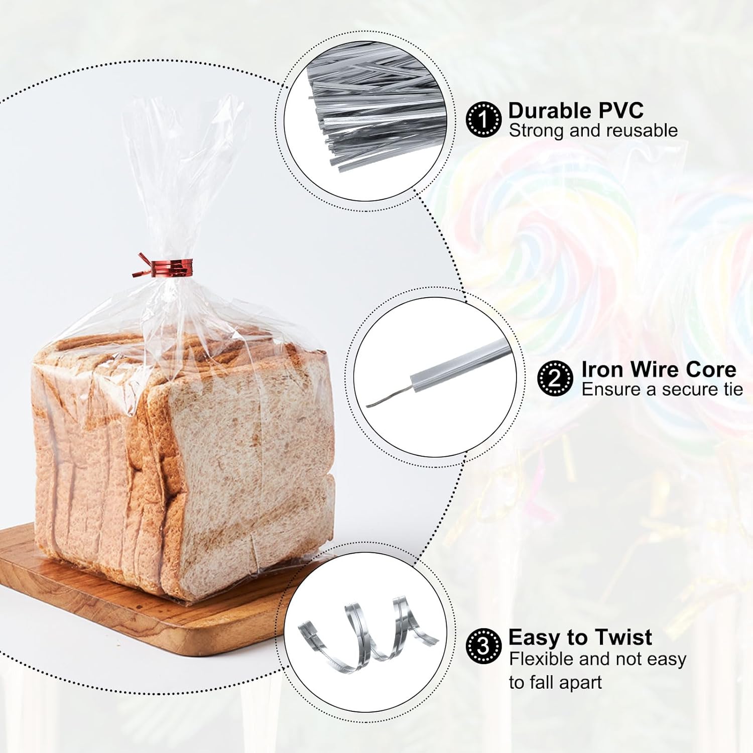 - Material - Made of durable PVC material with iron wire core, the bread twist ties are strong and reusable, which can be twisted flexibly and are not easy to fall apart.