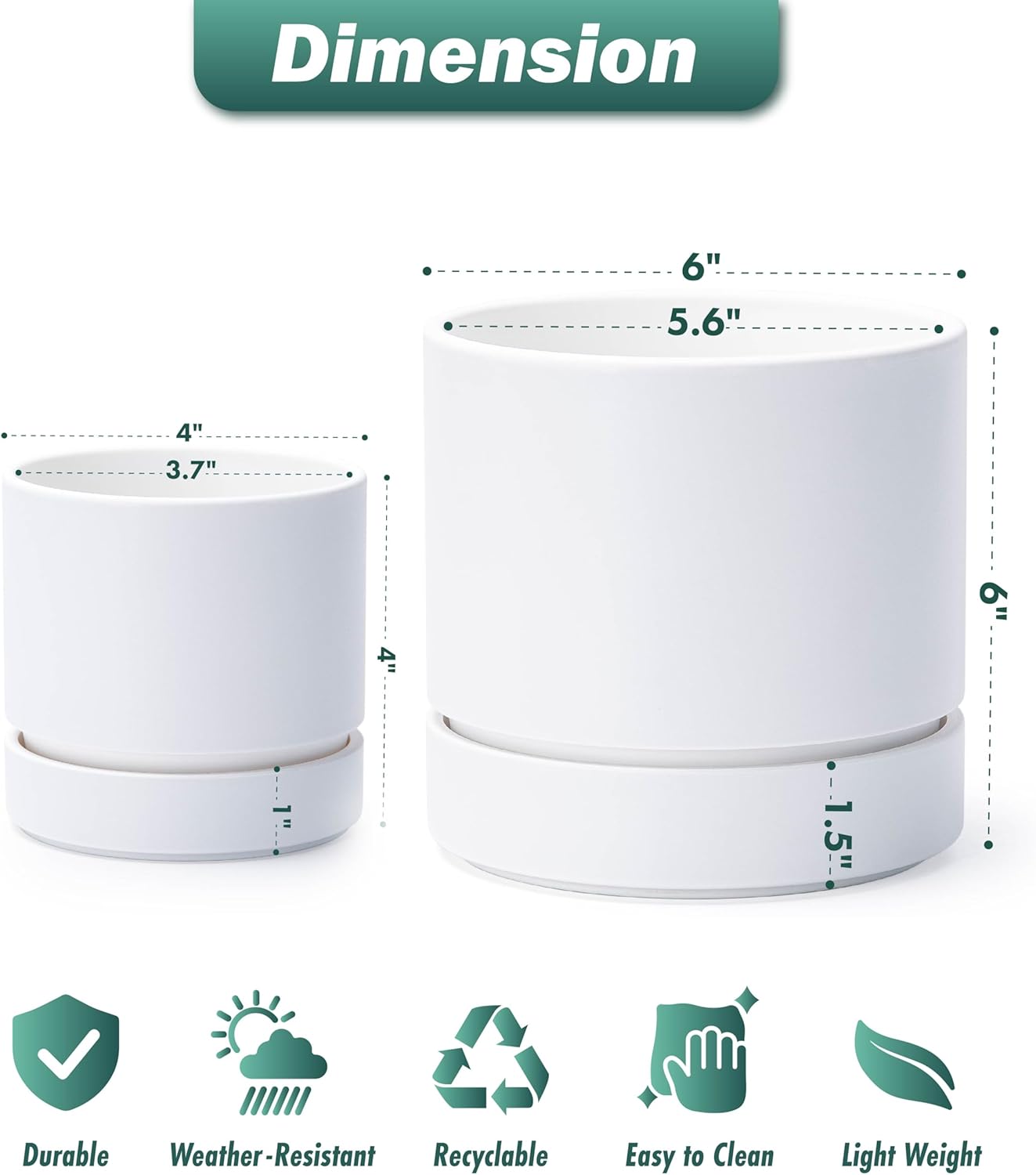- Two Size Set: Includes a 4-inch pot (4" diameter, 4" height) and a 6-inch pot (6" diameter, 6" height). Ideal for a variety of small to medium plants. Please refer to the dimension image for exact measurements.