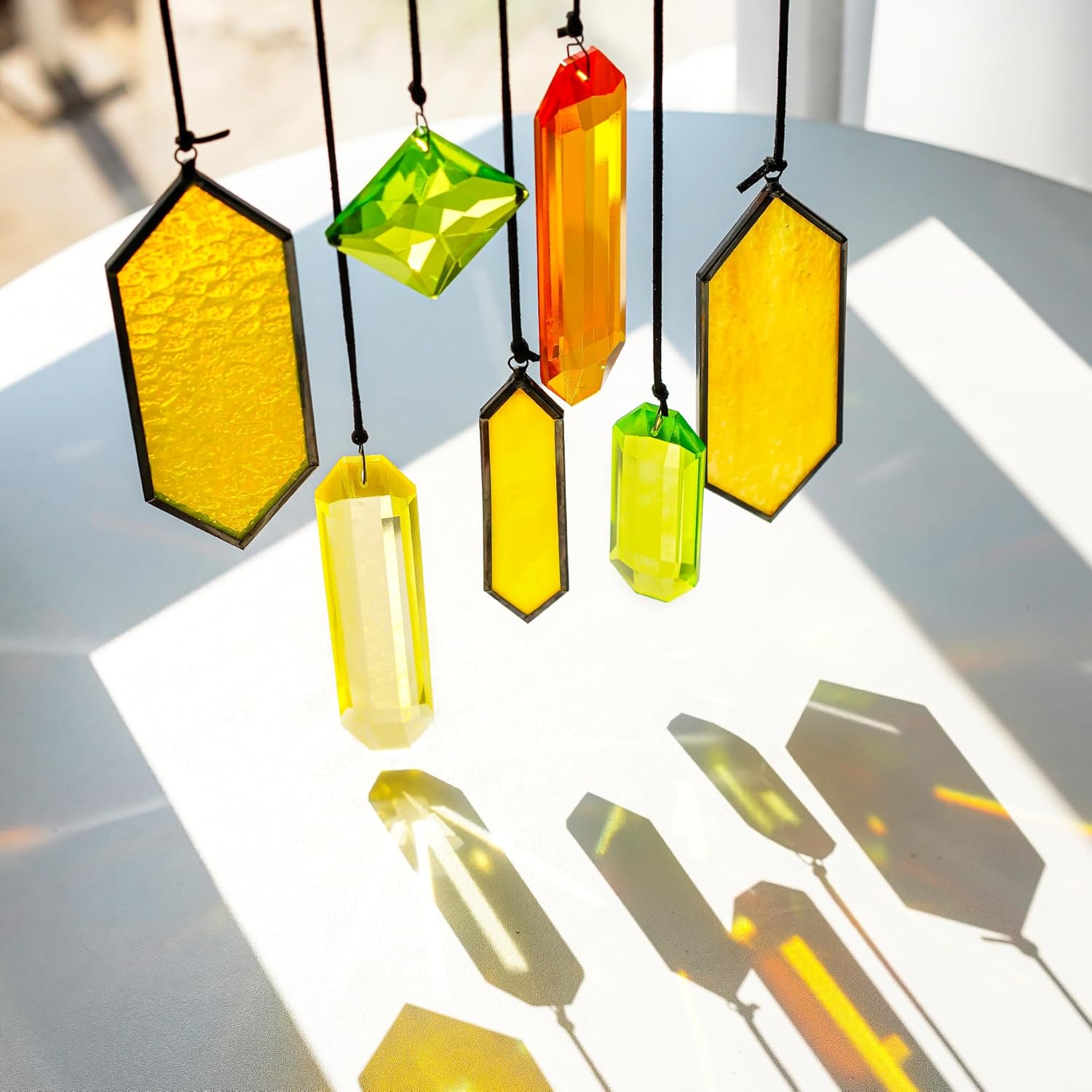 - Features: Including 4pcs crystal prisms and 3pcs stained glass panels, combining with yellow, orange and green color, just like Fairy Tale Forest, creating a dazzling sparkle when exposed to sunlight