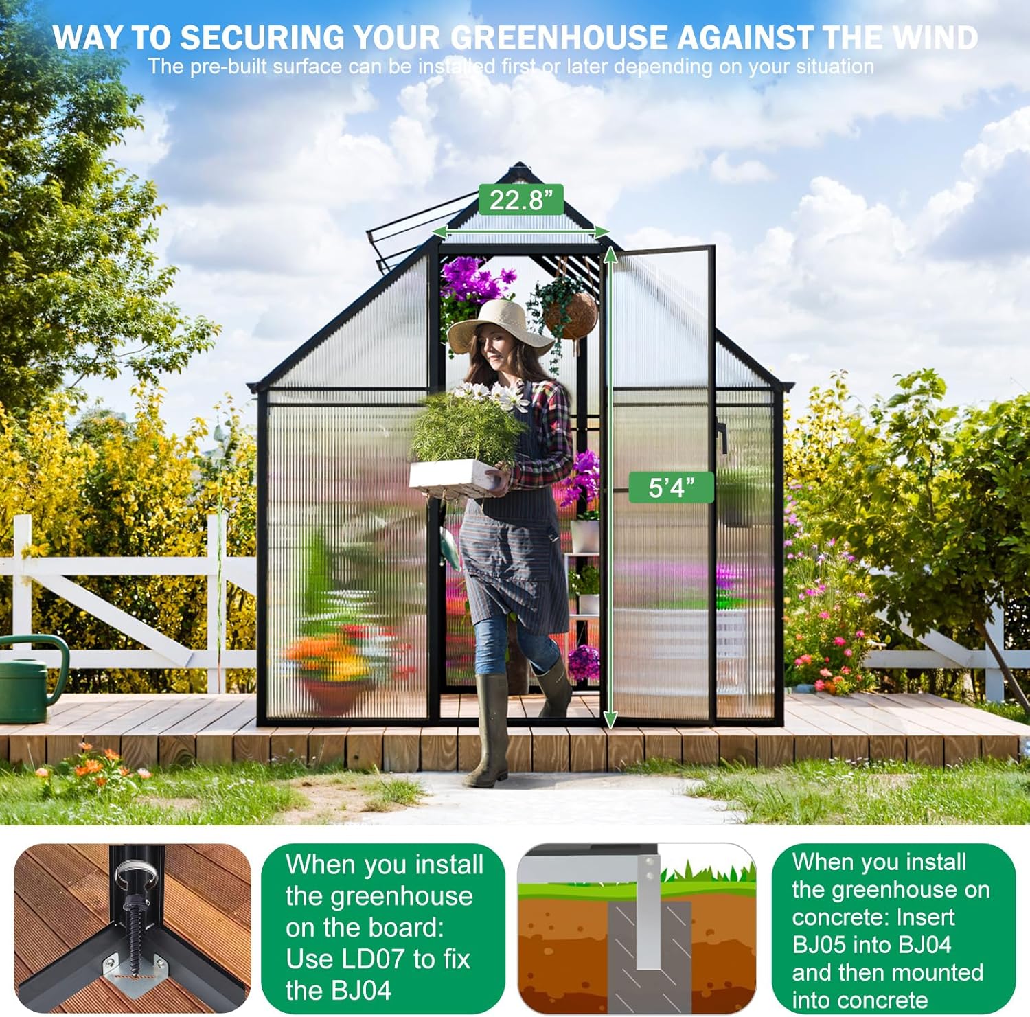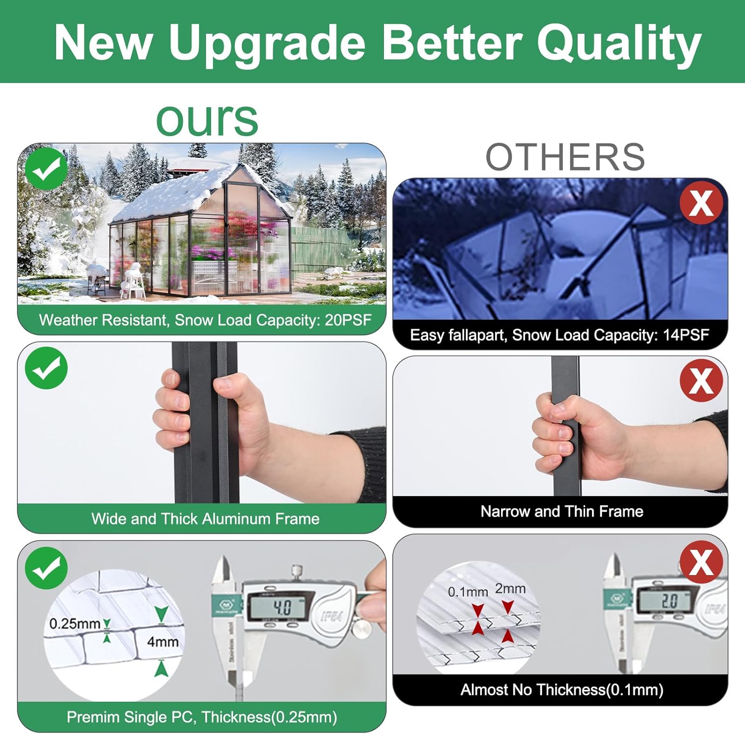 - Sturdy Frame: Our greenhouse kit boasts a robust rust-resistant aluminum frame designed to withstand various weather conditions. Introducing patented technology, Easy assembly, saving you 50% of your time. Gone are the days of tedious setups. With a simple push and locking screw, our Quick Connect ensures a reliable, secure, and swift link-up. It can also support snow loads of up to 20PSF.
