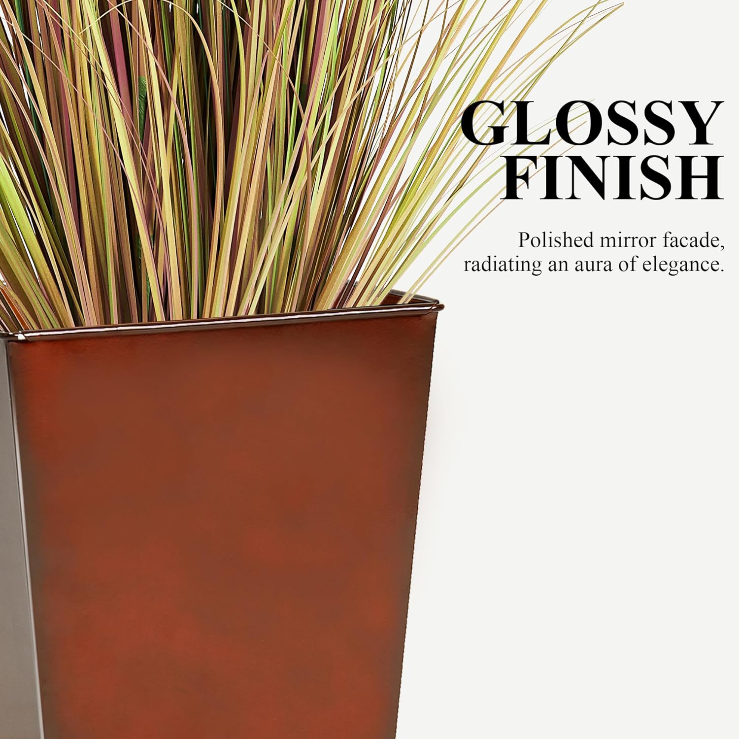 Worth Garden Large Metal Glazed Planter Set of 2 (25" + 28"), Luxurious Glossy Finish Red Tall Square Tapered Steel Plant Pot, Decor Flower Pot Indoor & Outdoor, Drainage Hole & Dual-Purpose Saucer