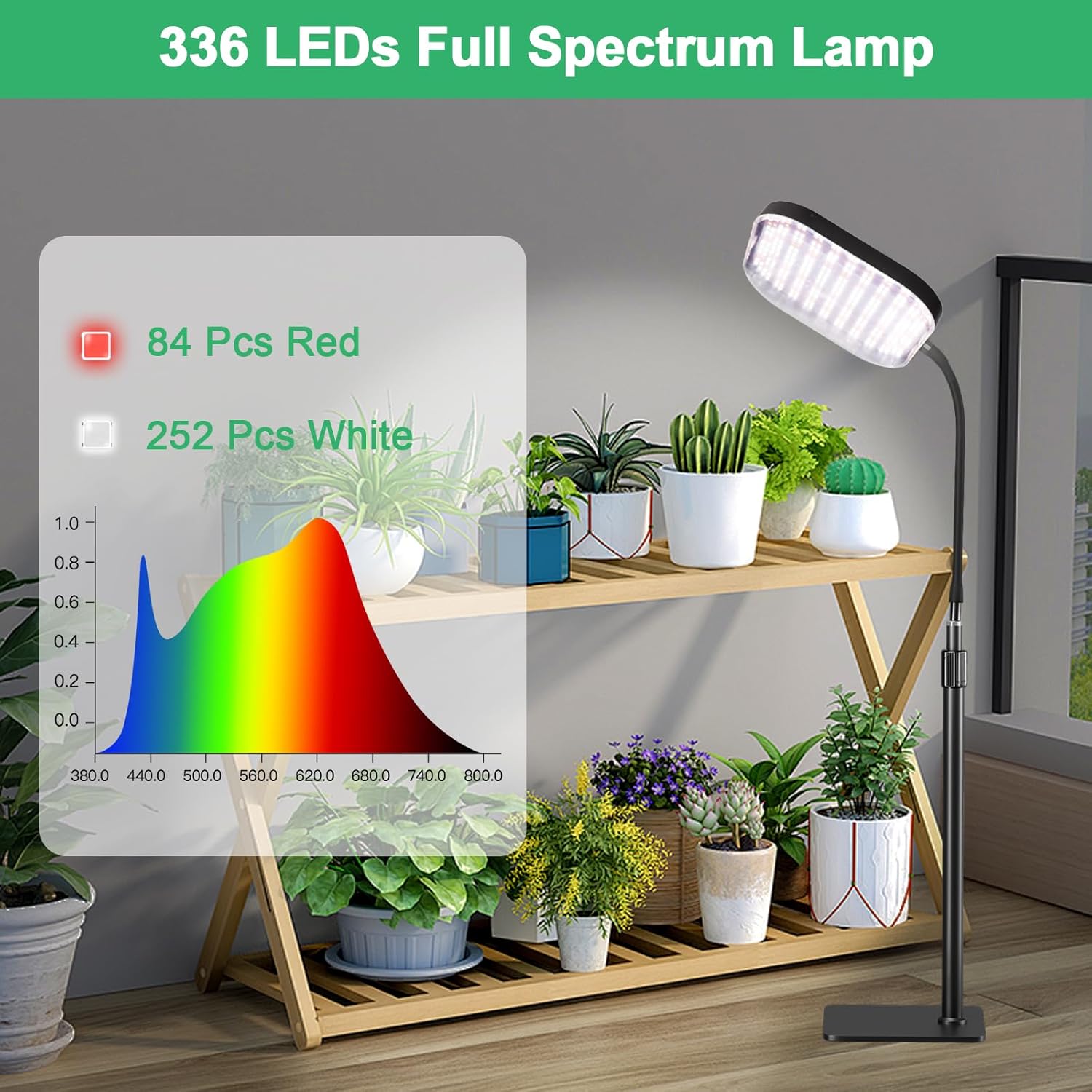 - Higher Efficiency and Upgraded Style: The 6000k Full Spectrum floor lamp equiped with 336 LEDs can provide higher levels of illumination for plant growth. The grow lights applying updated technology have 50,000 hours long lifetime, good for indoor growing.
