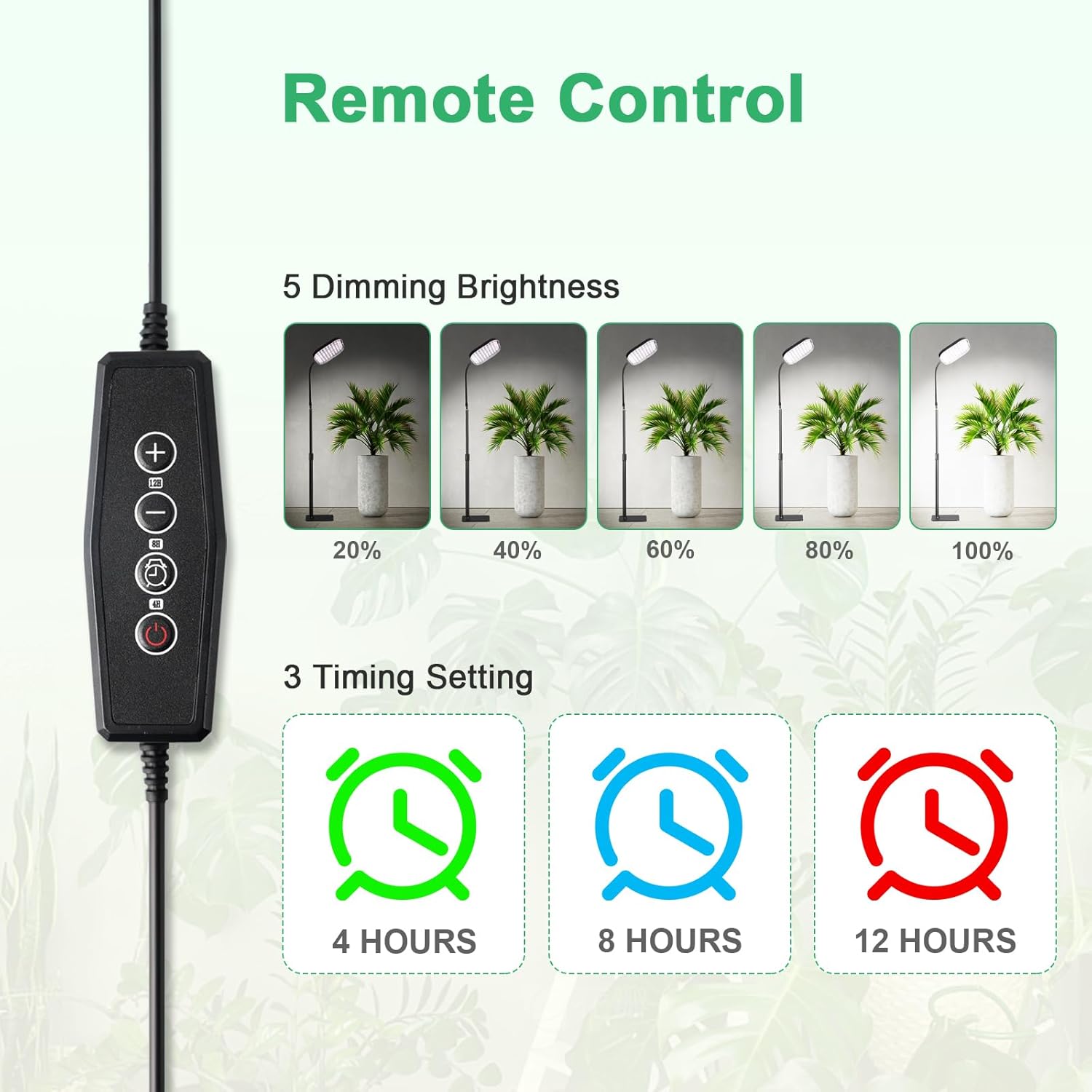 - 3 Time Settings and 5 Brightness Levels: The standing plant light support 4/8/12h timer settings, in 24h cycle, the plant lights will work 4/8/12h as you set. Likewise, you can also set 5 brightness levels, which helps you adjust the light requirements for your plants at different growth stages.