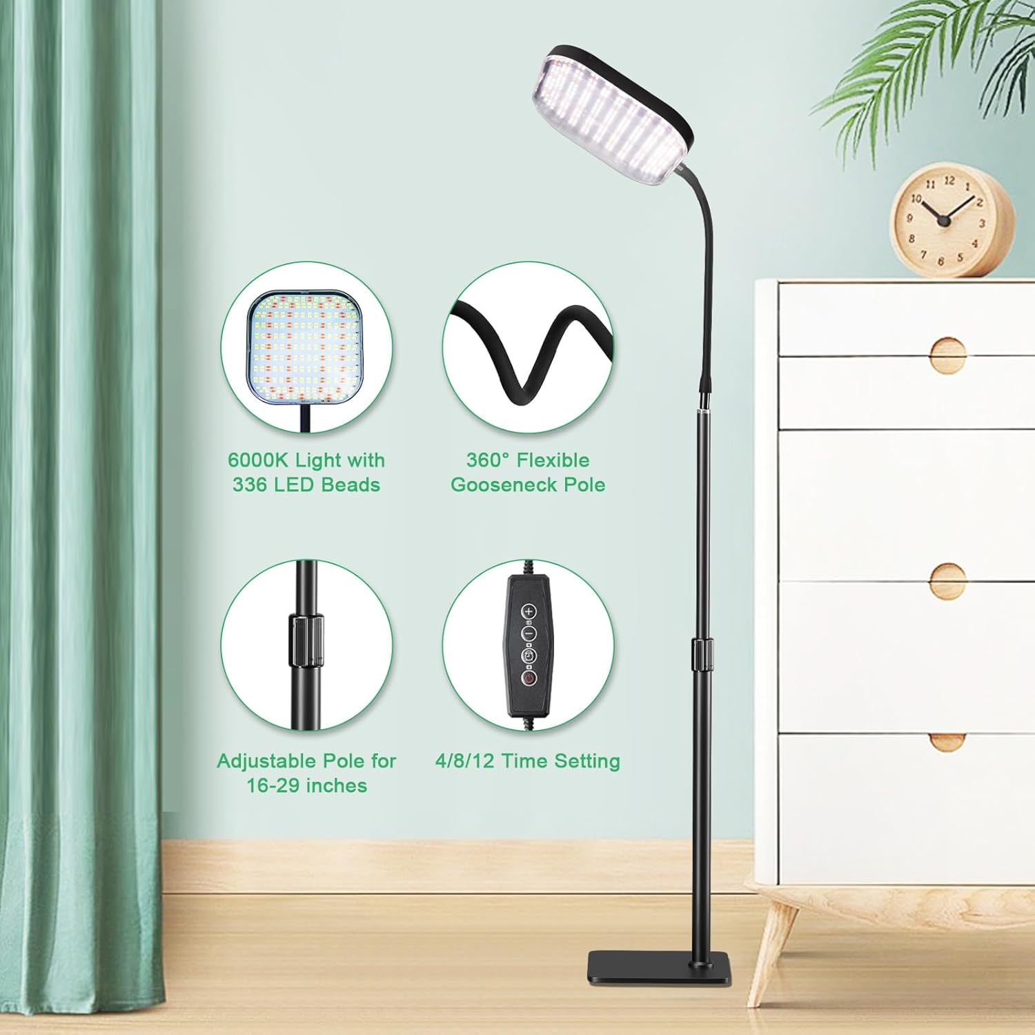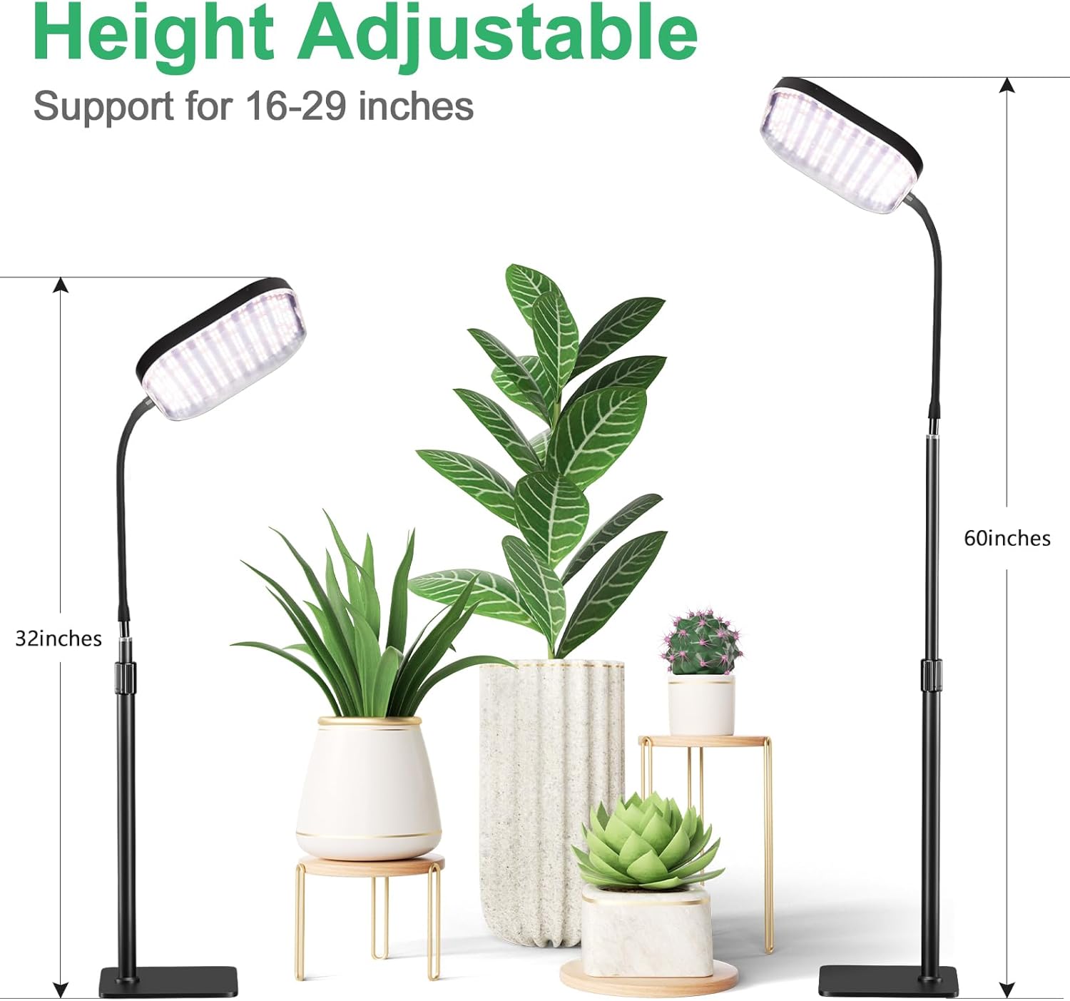 - Convenience and Practical Components: The freely extendable adjustable rod of standing lamp provides 16-29 adjustable space,which can take care of large plants like bananas and small desktop plants like roses and aloe. The 360Β° gooseneck part can be adjusted to your needs to facilitate more thoughtful care of the plants.
