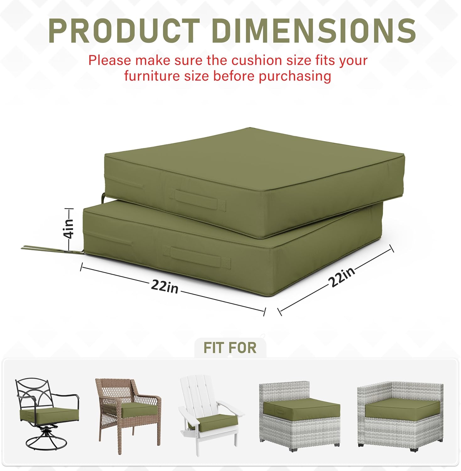 Patio Chair Cushions 22 X 22 X 4 Inch Waterproof Outdoor Seat Cushions for Patio Furniture, Outdoor Sofa Couch Pads with Ties & Handle, Set of 2, Light Green
