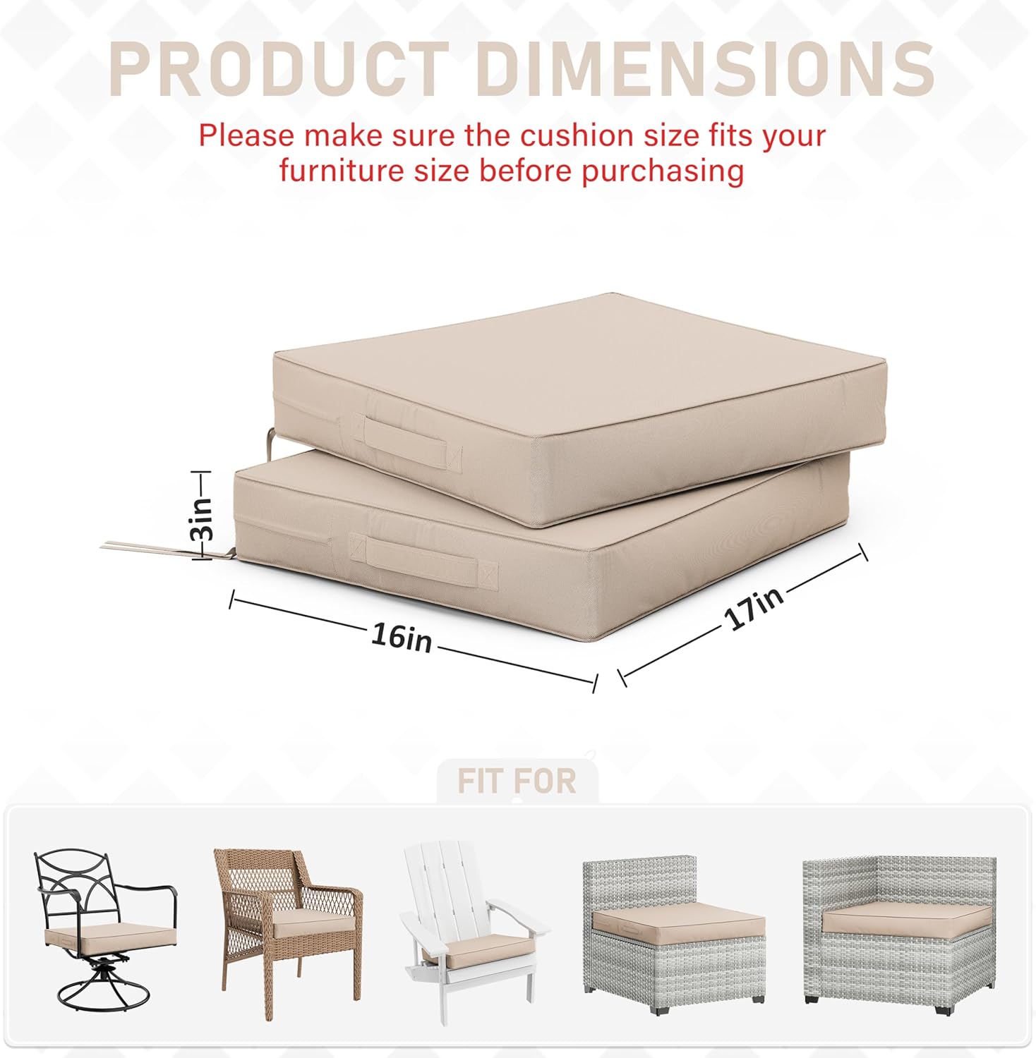 - π About Size - The Tounosnt Double Seat Cushion Set package includes 2 outdoor chair cushions (17β L x 16β W x 3β H). Please measure your seating area. The correct size is essential for enhancing your comfort and overall aesthetic.