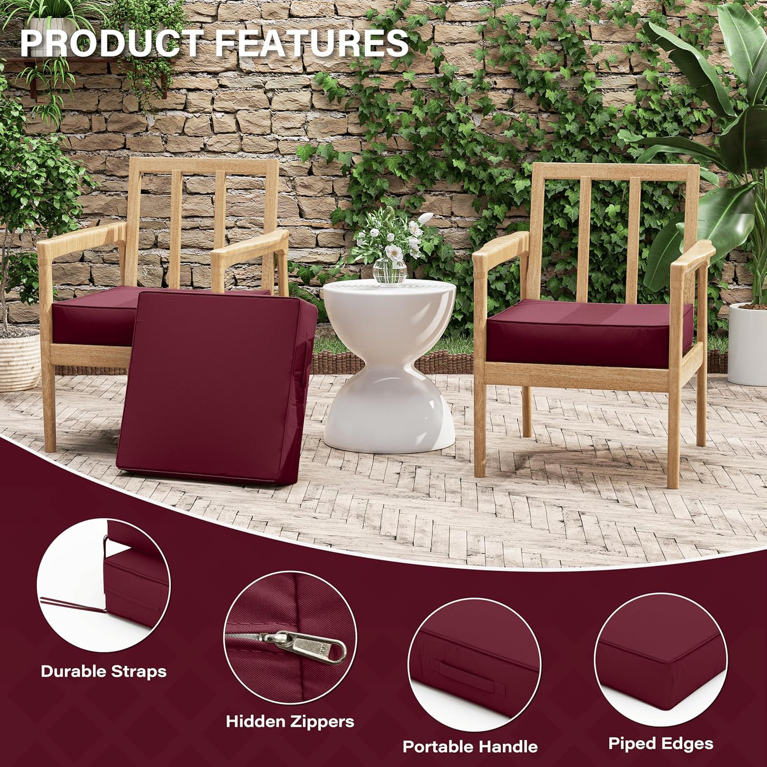Patio Chair Cushions 19 X 19 X 4 Inch Waterproof Outdoor Seat Cushions for Patio Furniture, Outdoor Sofa Couch Pads with Ties & Handle, Set of 2, Burgundy