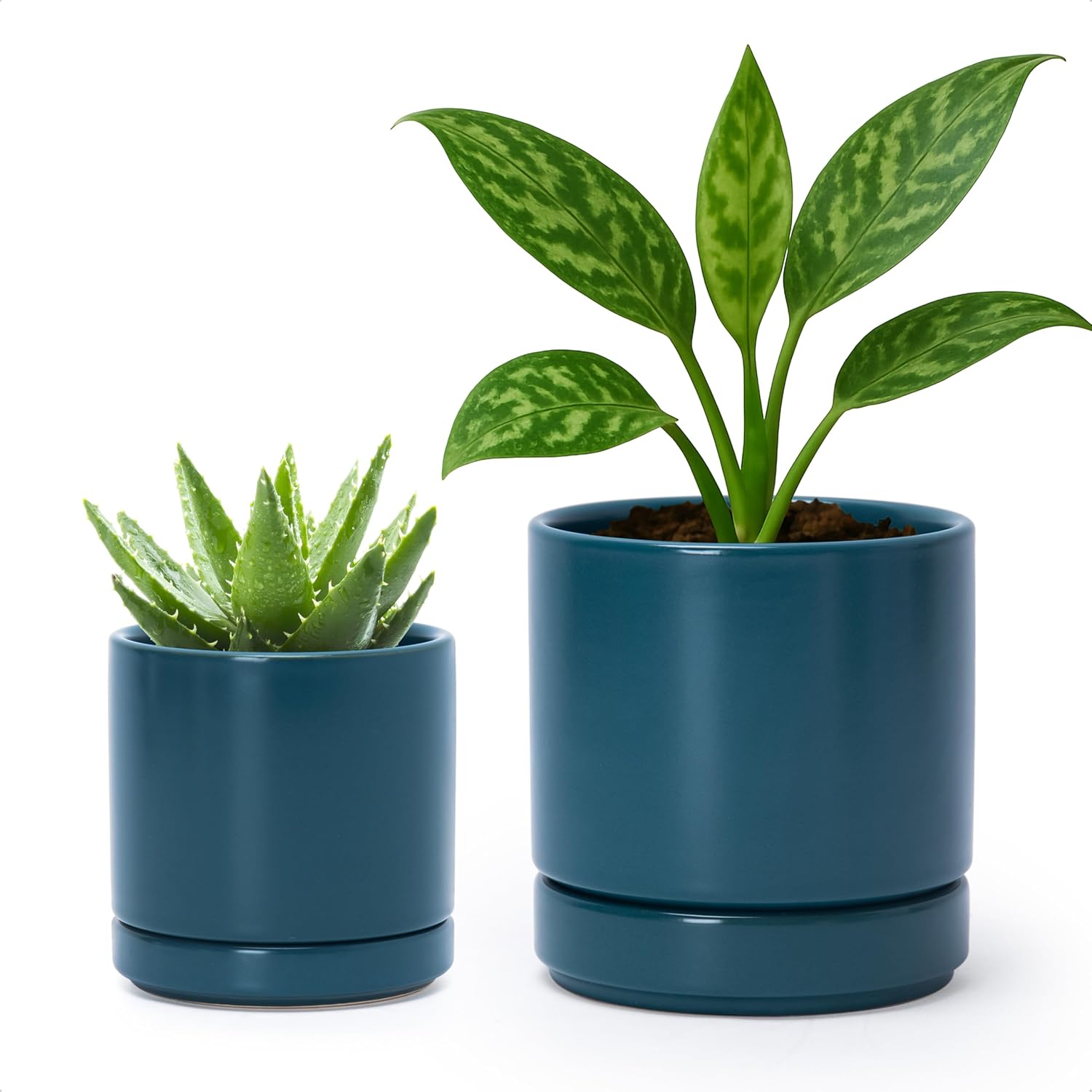 D'vine Dev 3.5 Inch & 4.7 Inch Ceramic Planter Pots for Plants with Drainage Hole and Saucer, X-Small Plant Pots Set, Teal, 94-G-XS-9