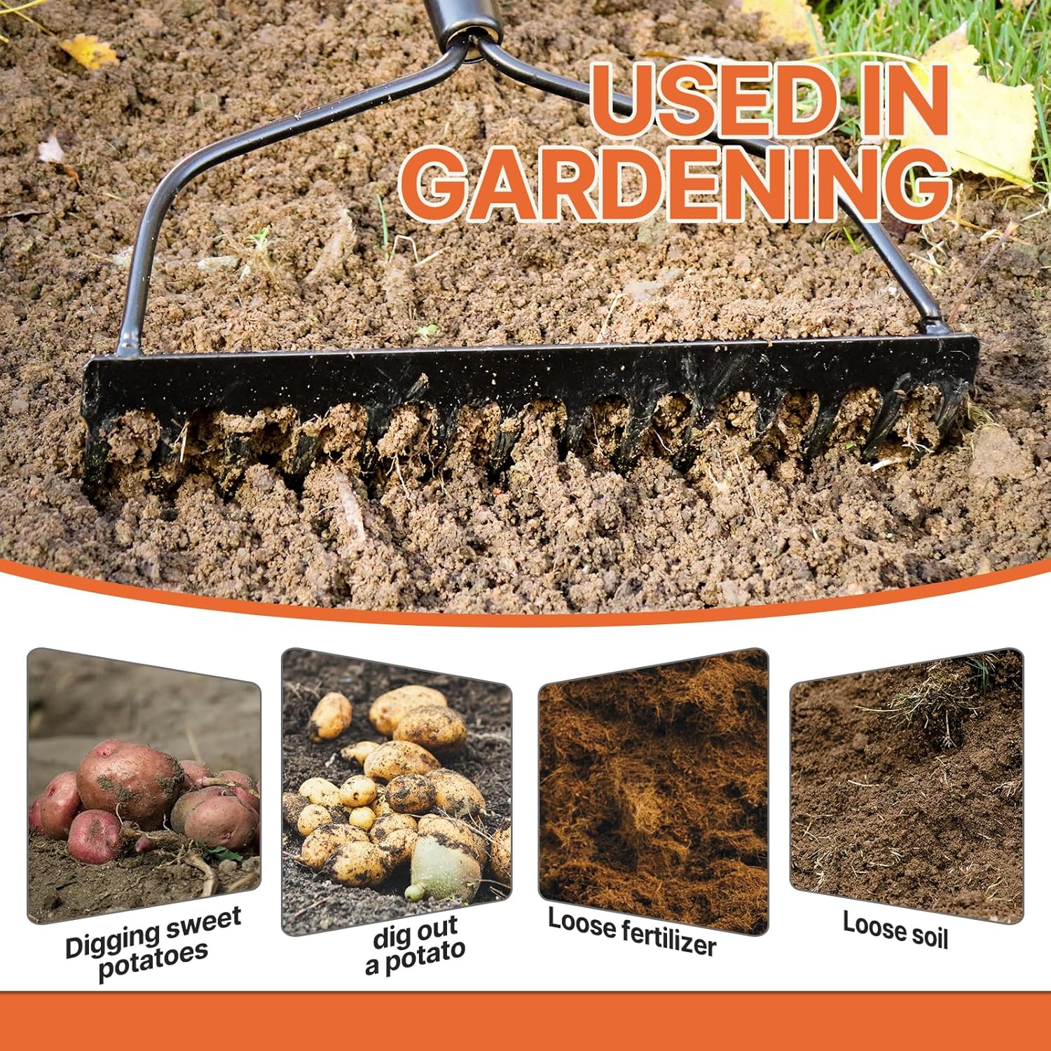 - Multi purpose:garden rake good for leveling/packing soil and raking leaves especially in between plants.Equally suitable for distributed newly laid topsoil,moving soil or mulch.