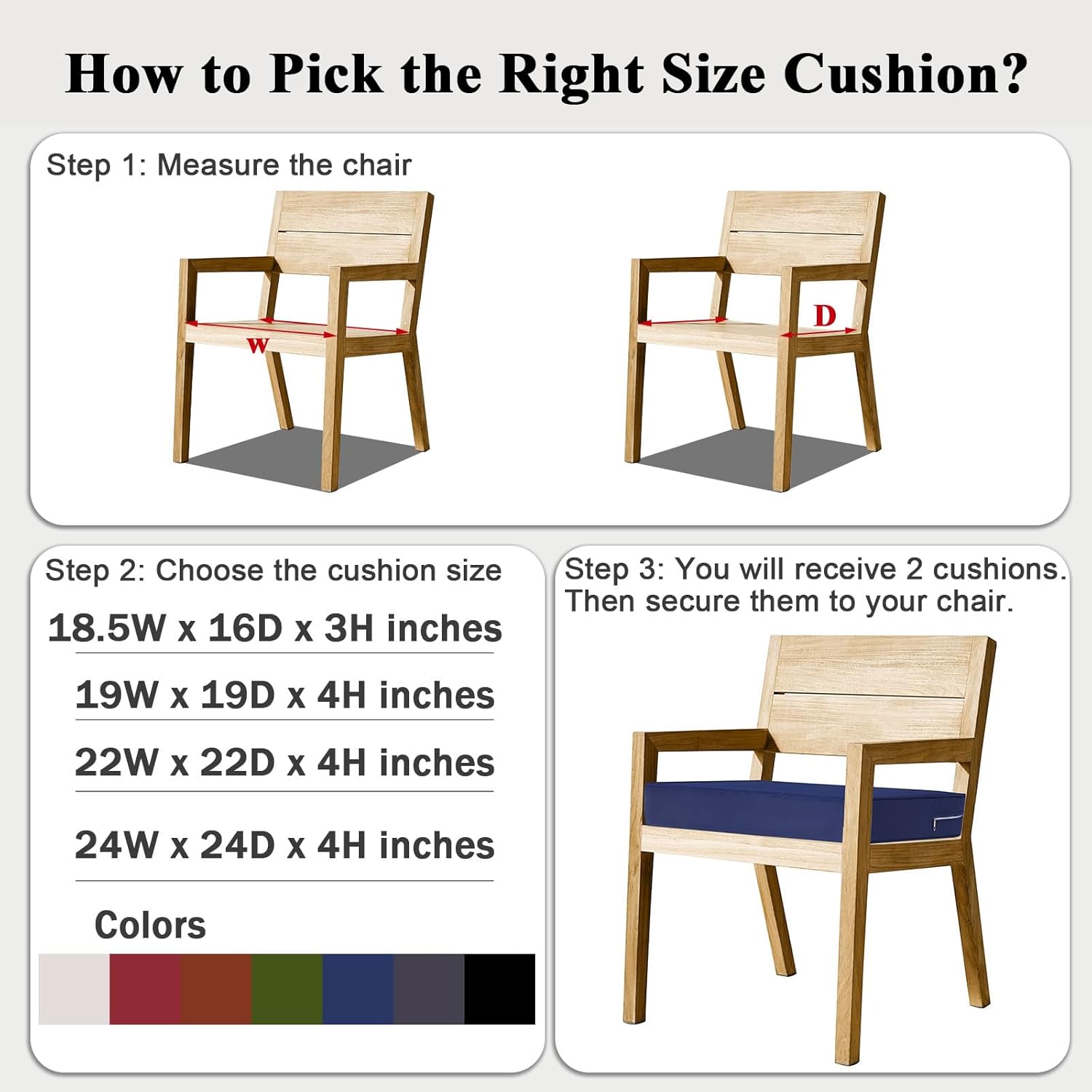 - PERFECT SIZE: Outdoor chair cushion set includes 2 cushions. Cushions measure: 18.5 inch (W) 16 inch (D) 3 inch (H). Fits most standard size outdoor chairs. Since the outdoor cushions are vacuum-packed, it may take 24-49 hours for the cushion foam to fluff back up after opening the vacuum bag
