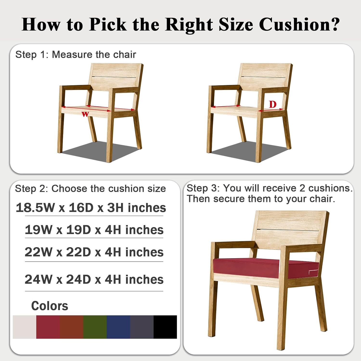 - PERFECT SIZE: Outdoor chair cushion set includes 2 cushions. Cushions measure: 22 inch (W) 22 inch (D) 4 inch (H). Fits most standard size outdoor chairs. Since the outdoor cushions are vacuum-packed, it may take 24-53 hours for the cushion foam to fluff back up after opening the vacuum bag
