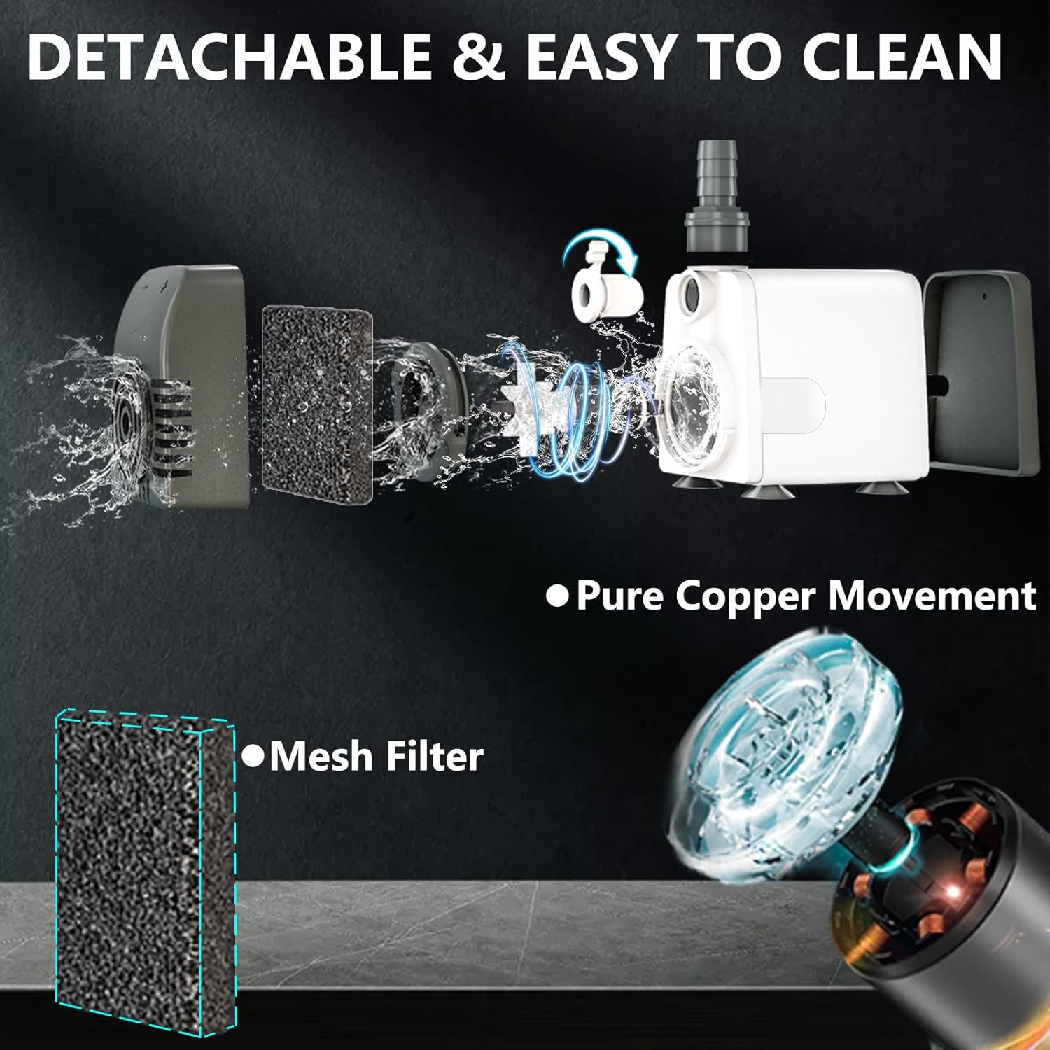 - 【STRONG POWER & QUIET OPERATION】This submersible water pump built-in pure copper motor, more powerful and durable. It’s ultra quiet,running at a ‘whisper’ level, produce no noise, giving you a quiet environment.