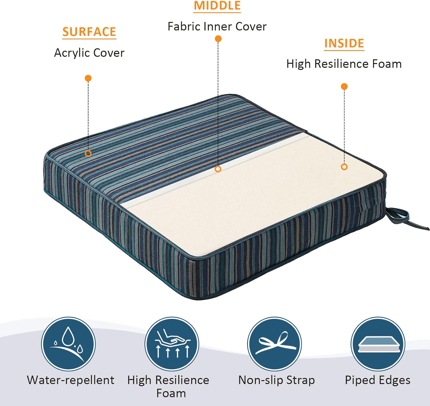 Sunbrella Square Corner Seat Cushions, 19" x 19" x 3", Set of 4, Indoor Outdoor Water Repellent Universal Chair Pads with Ties for Patio Furniture, Garden Dining Chairs, Troupe Dock
