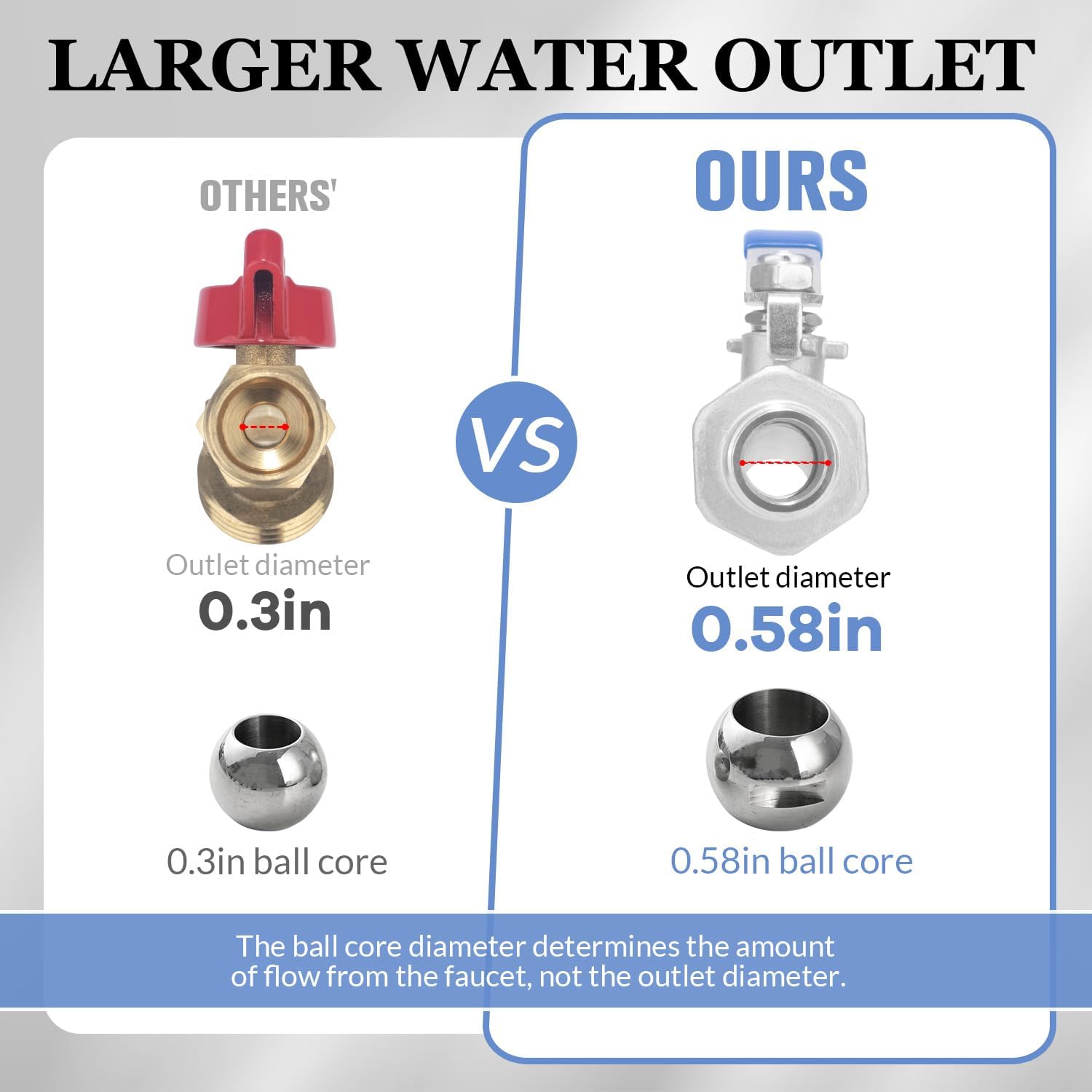 - High flow design: The newly upgraded 0.58 inch diameter large-sized ball valve allows even foreign objects such as leaves to easily flow out, resulting in a larger and more stable flow rate