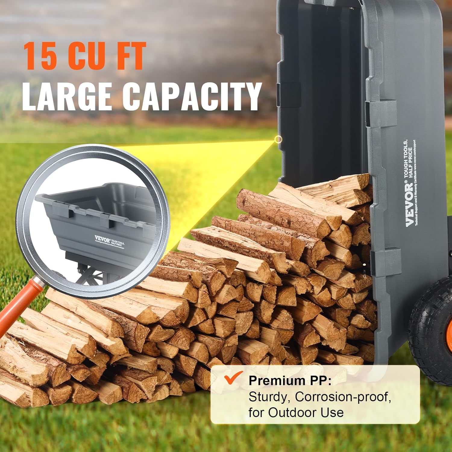 - 13in ALL TERRAIN WHEELS: With 13" large rubber tires, the yard cart provides excellent shock absorption, navigating uneven garden terrain or grassy slopes, ensuring smooth transport.