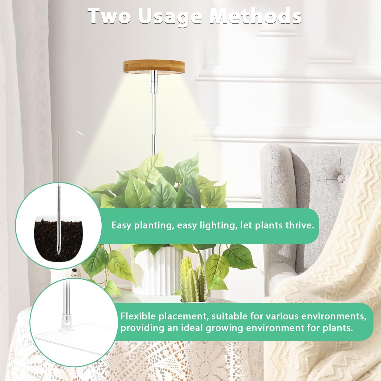 - Desk Grow Light for Home Garden Lighting Solution: This plant grow light comes with a detachable base, it has 2 use methods: 1. Base method ; 2. Insert into the soil directly. perfect solution for office desk,living room, dark corner in house,doesn’t take up valuable space, they just fit in with decor.Halo light design to help your plants grow happier and healtier!
