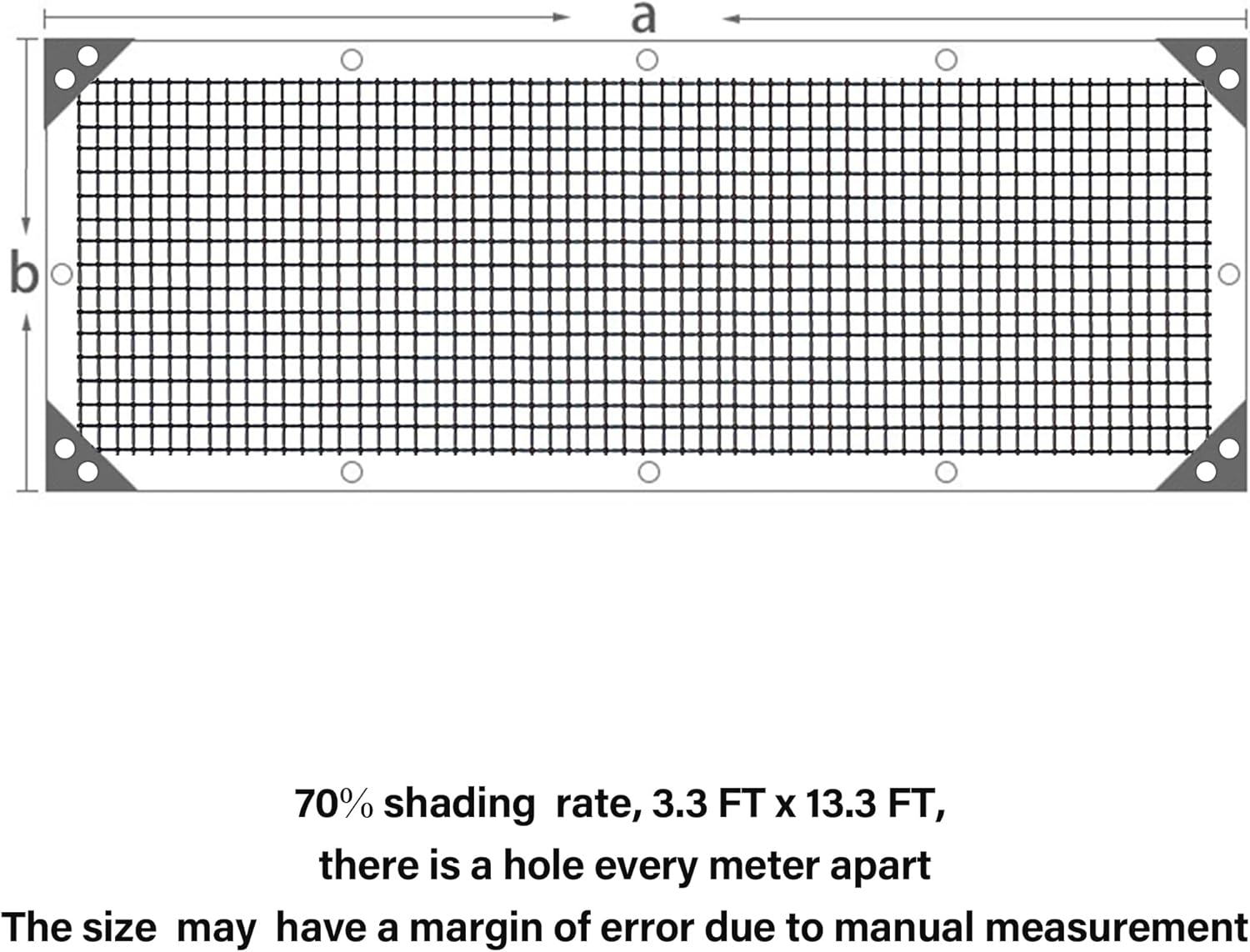 - High Shade Rate: The garden mesh tarp measures 3.3 x 13.3 FT. Our Shade Cloth can resist rays and most sunlight while air can still flow through so as to create a comfortable cool and shaded place for people or plant. It blocks 70% of the sunshine and bring 30% the shadow, so 30% of the sunshine can through it.