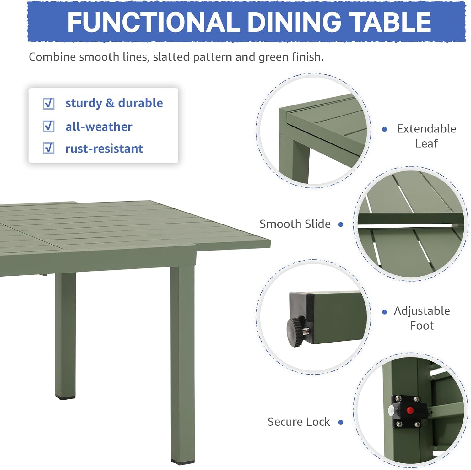 Soleil Jardin Aluminum Patio Extendable Dining Table, 59" - 83", Adjustable Indoor Outdoor Furniture Rectangle Table for 6-8 Person Porch Deck Garden, Green