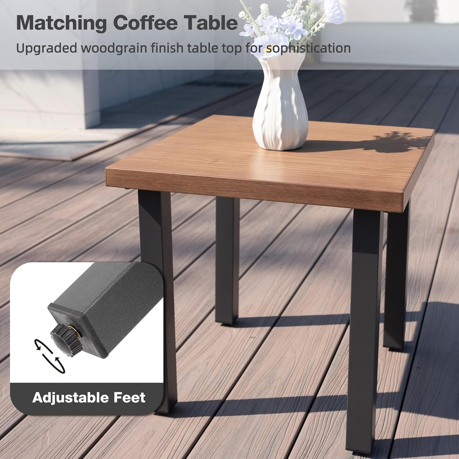 - Ergonomic and Modern Design: Comes with two chairs and a coffee table with upgraded woodgrain finish table top, the modern design adds sophistication to any patio, balcony or porch. Enjoy outdoor time with our patio swivel chairs