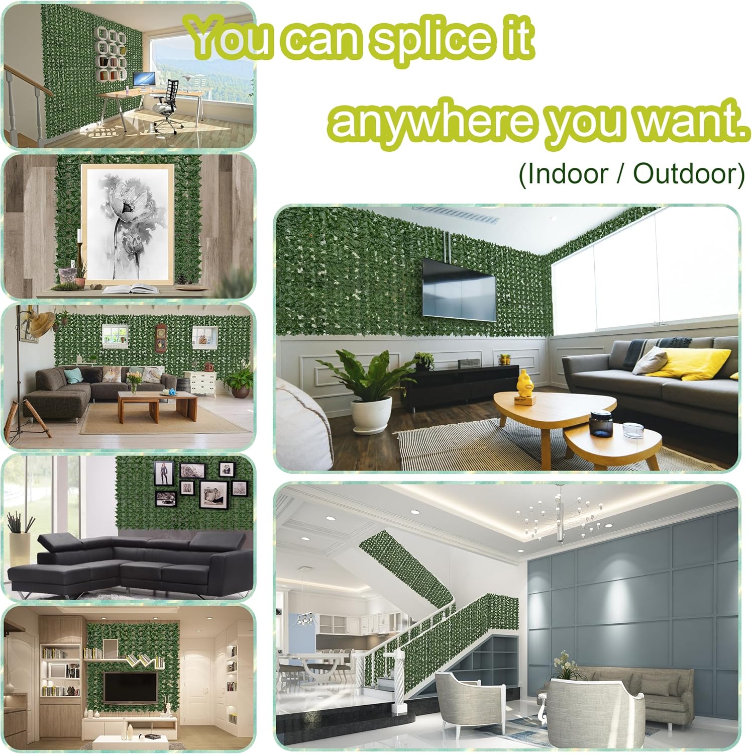 - Easy installation: the size of the artificial ivy grass wall panels is 48"×128" , which can be cut into any shape and size you want, and each panel is equipped with interlocking connectors for easy and simple connection. Install it in your room or fence with adhesive tape or our attached cable ties.