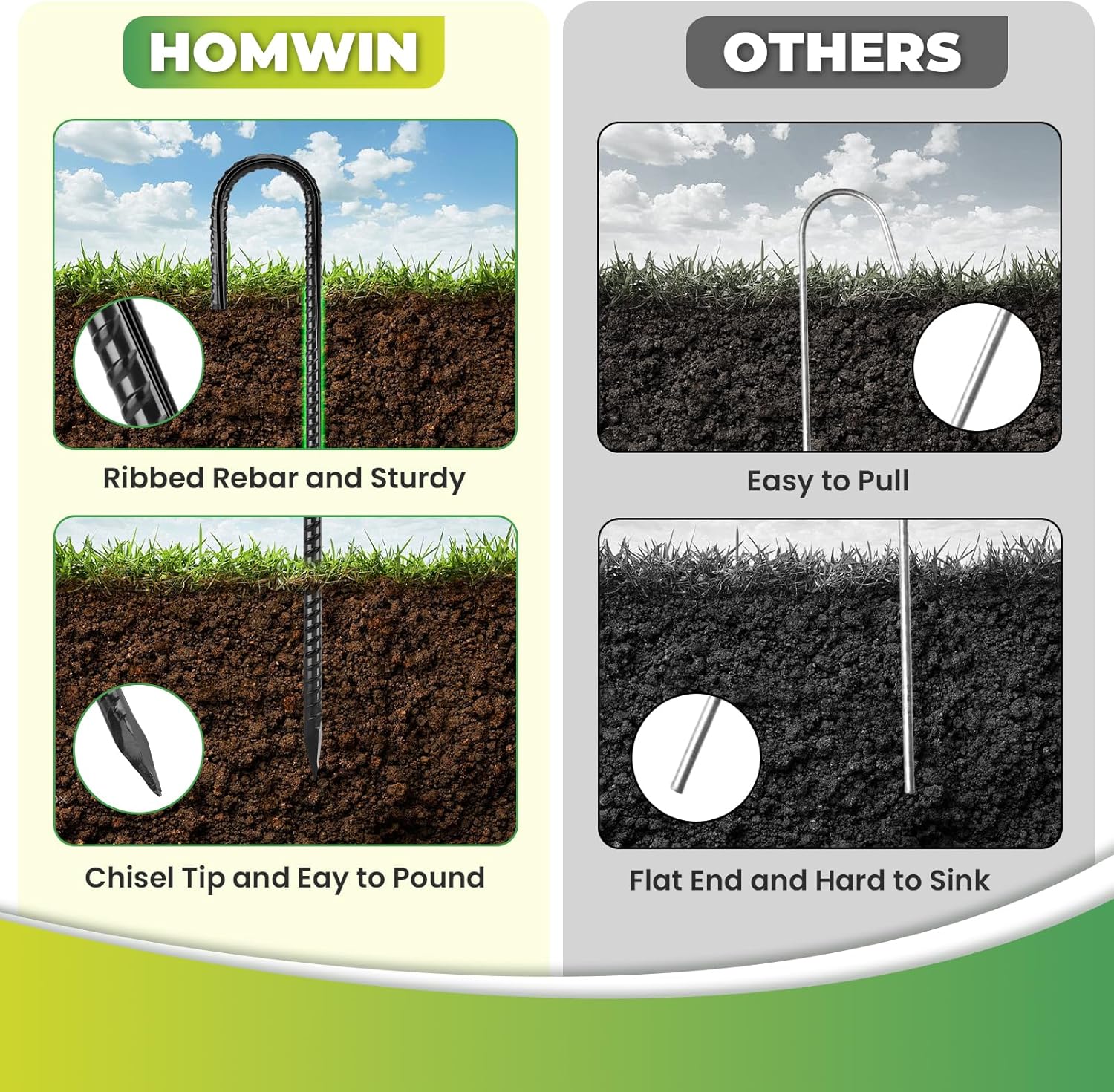 - Wide Applications - If you own any kind of tent, canopy or storage shed you know what comes with them is useless. These are perfect rebar stakes with ridges to grip the ground, widely used in camping tent, yard decorations, garden fence stakes and yard anchors.