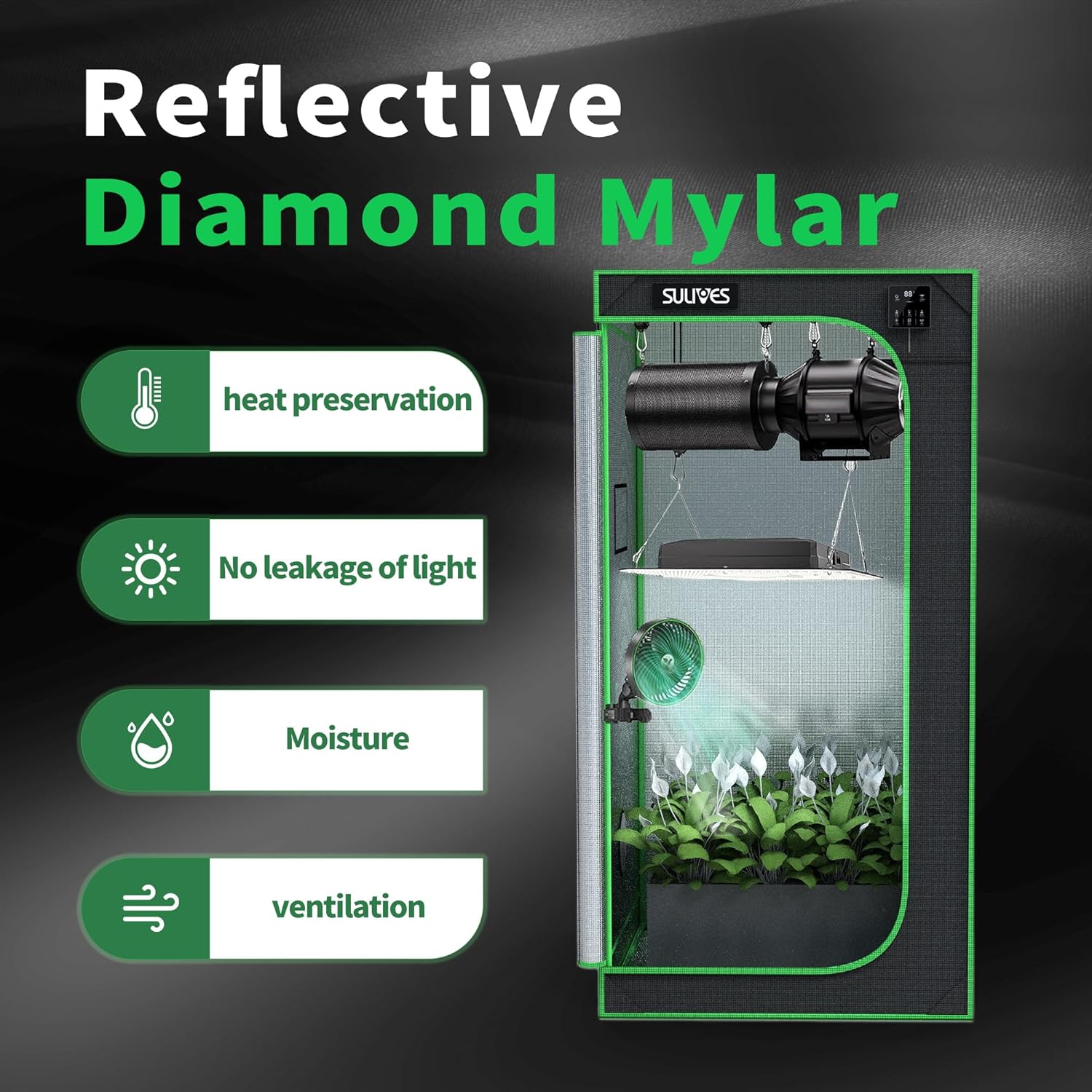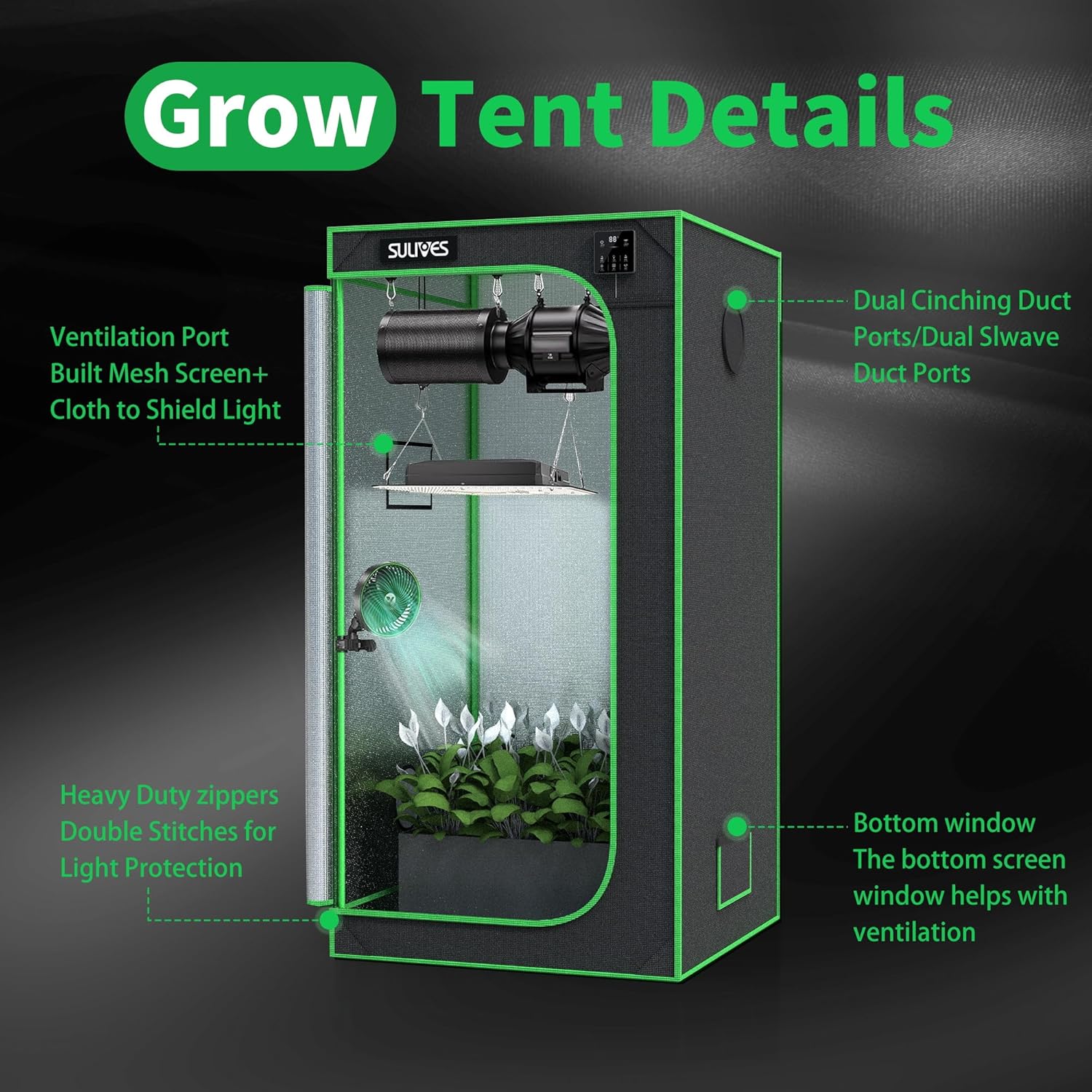 - 【Keep All Light in】SULIVES Grow Tent blocks all light from escaping and is lined with 100%-reflective mylar to boost the output efficiency of your setup; No need for additional flaps or tape, just zipper the black lining to create a lightproof seal