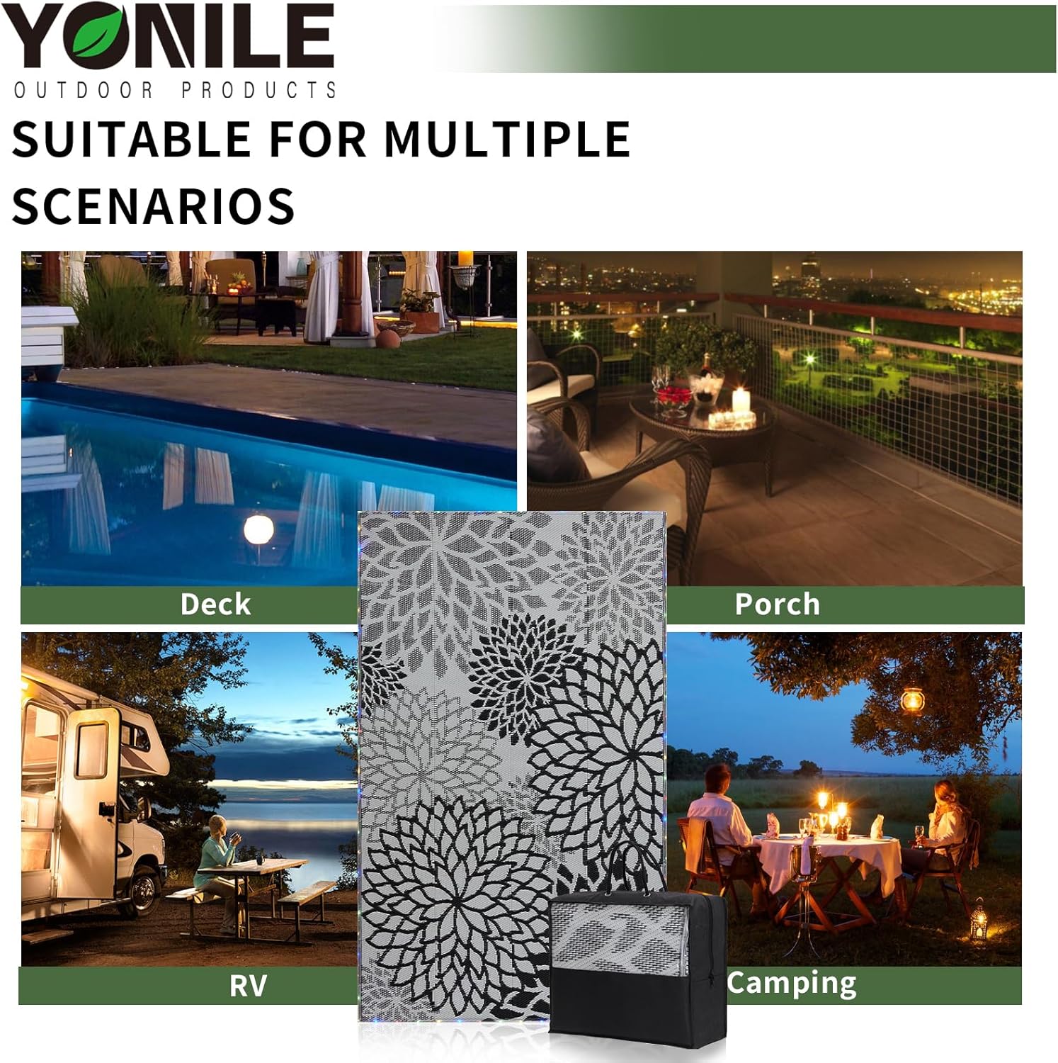- Customer Service :YONILE outdoor rugs are suitable for patio, camper, RV road trips, camping, balcony, picnic, porch, deck and garden. Multiple sizes for your choice (5'x8', 6'x9', 8'x10', 9'x12'). If you get any problem with our rugs, please contact us immediately, we will offer you a satisfactory solution