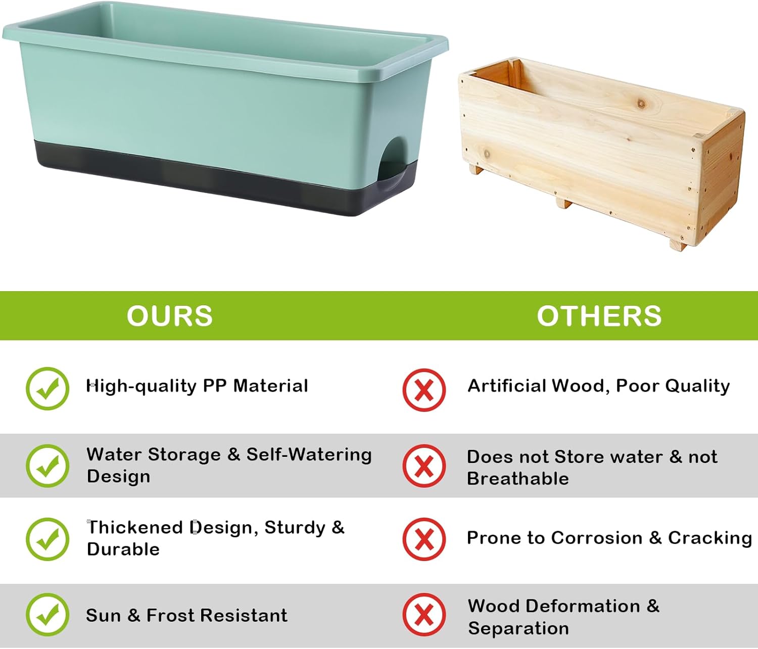- 【Premium & Durable】The planter pots are made of high quality PP material and has been thickened to bear up to 300KG (660LB). This window box planter is sturdy, wear-resistant and durable. It can be exposed to light, wind, and sunlight for long periods of time, with a lifespan of decades. It is an excellent planter box for both indoor and outdoor.