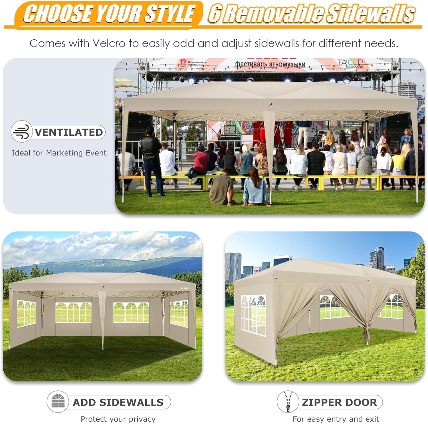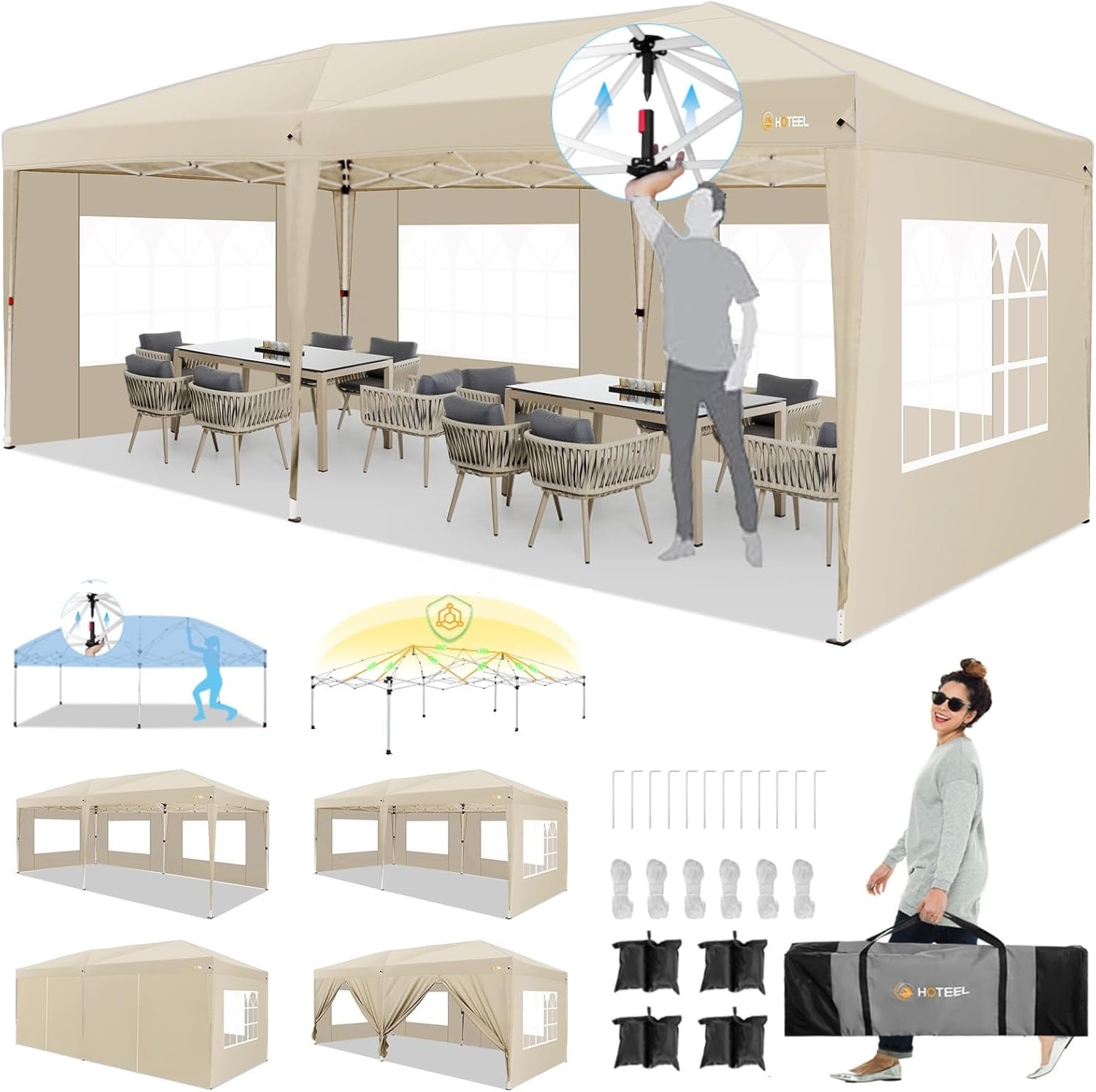 HOTEEL 10x20 Pop up Canopy with 6 Sidewalls, One Push Instant Setup Outdoor Canopy Tent with Reinforce Rod, Weight Bag, for Parties, Events, Khaki