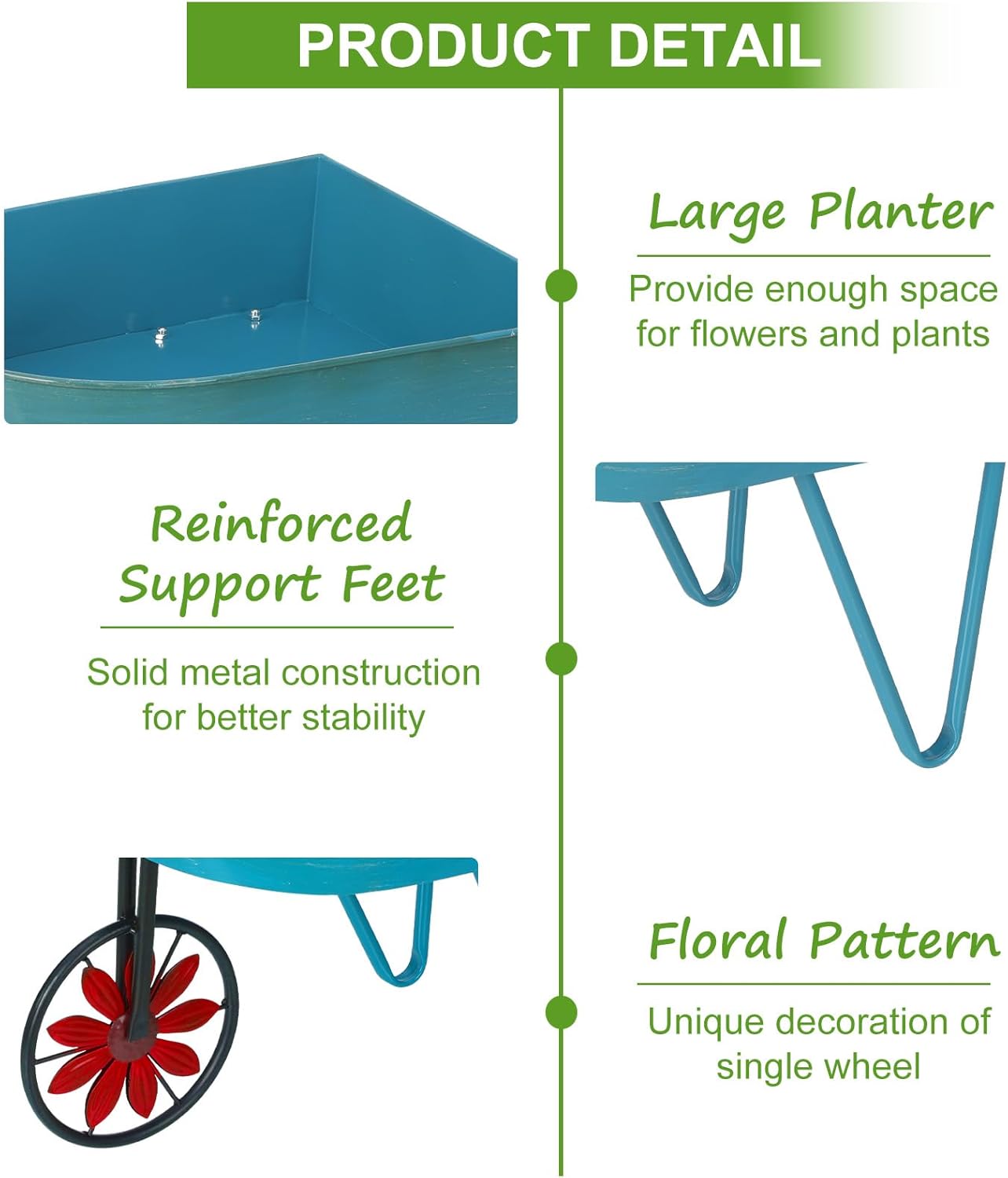 - Wheelbarrow Planters: Each vintage planter features a wheelbarrow design with distressed finish. Two handles and a non-rolling wheel with flower spokes are pretty and keep it securely in place. Add a fun addition to your home's outdoor area with them