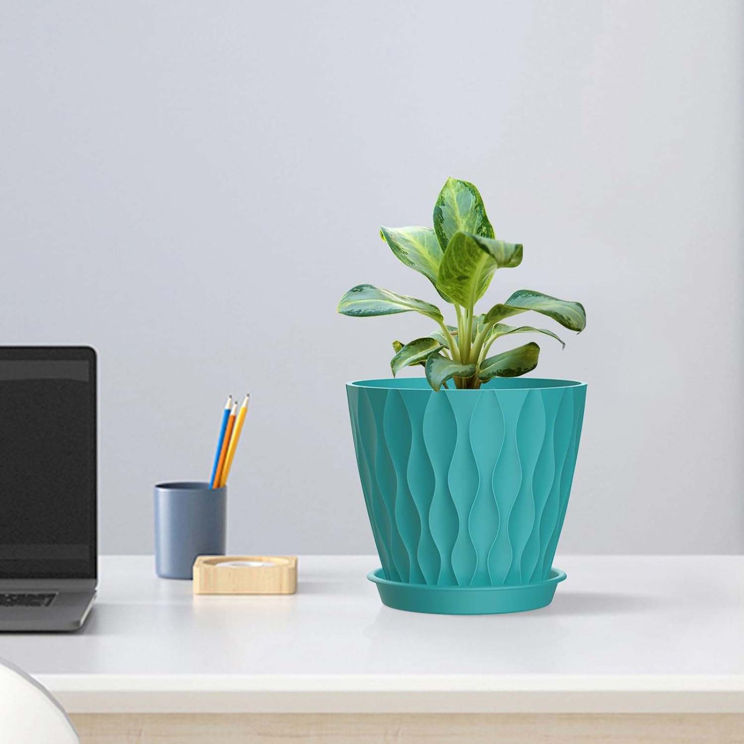 6 inch Flower Pots, 5 Pack Plant Pots for Indoor Plants, Water Ripples Plastic Planters with Drainage Holes and Saucers, Nursery Pots for Small Succulent Garden House Plants, Blue Green