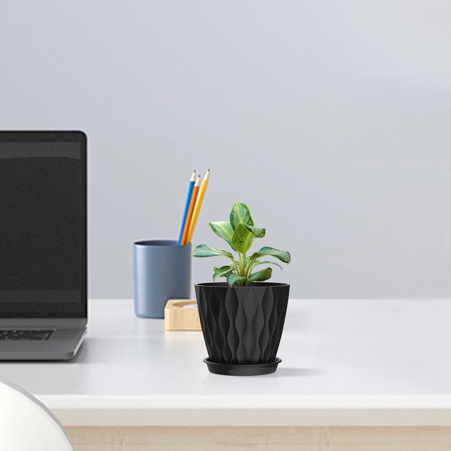 4 inch Small Plastic Nursery Pots, Seedling Pots, 5 Set Water Ripples Plant Pots for Indoor Plants, Flower Pots with Drainage Holes and Saucers, Seed Starter Pots for Succulent Plants, Black