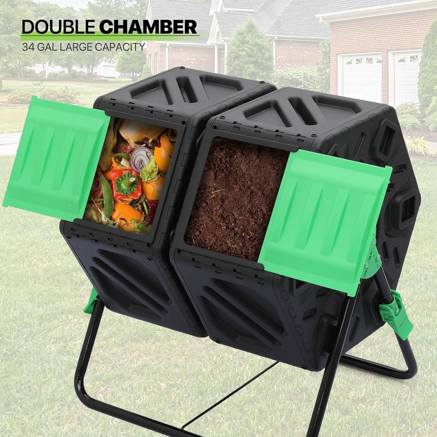 - Large Capacity: With a large capacity of 34 gallons (130 L), give your plants the nutrient-dense fertilizer they need and watch your garden bloom like never before! With a dual-chamber design tumbling composter, you get two compartments for faster and more efficient composting all year round.
