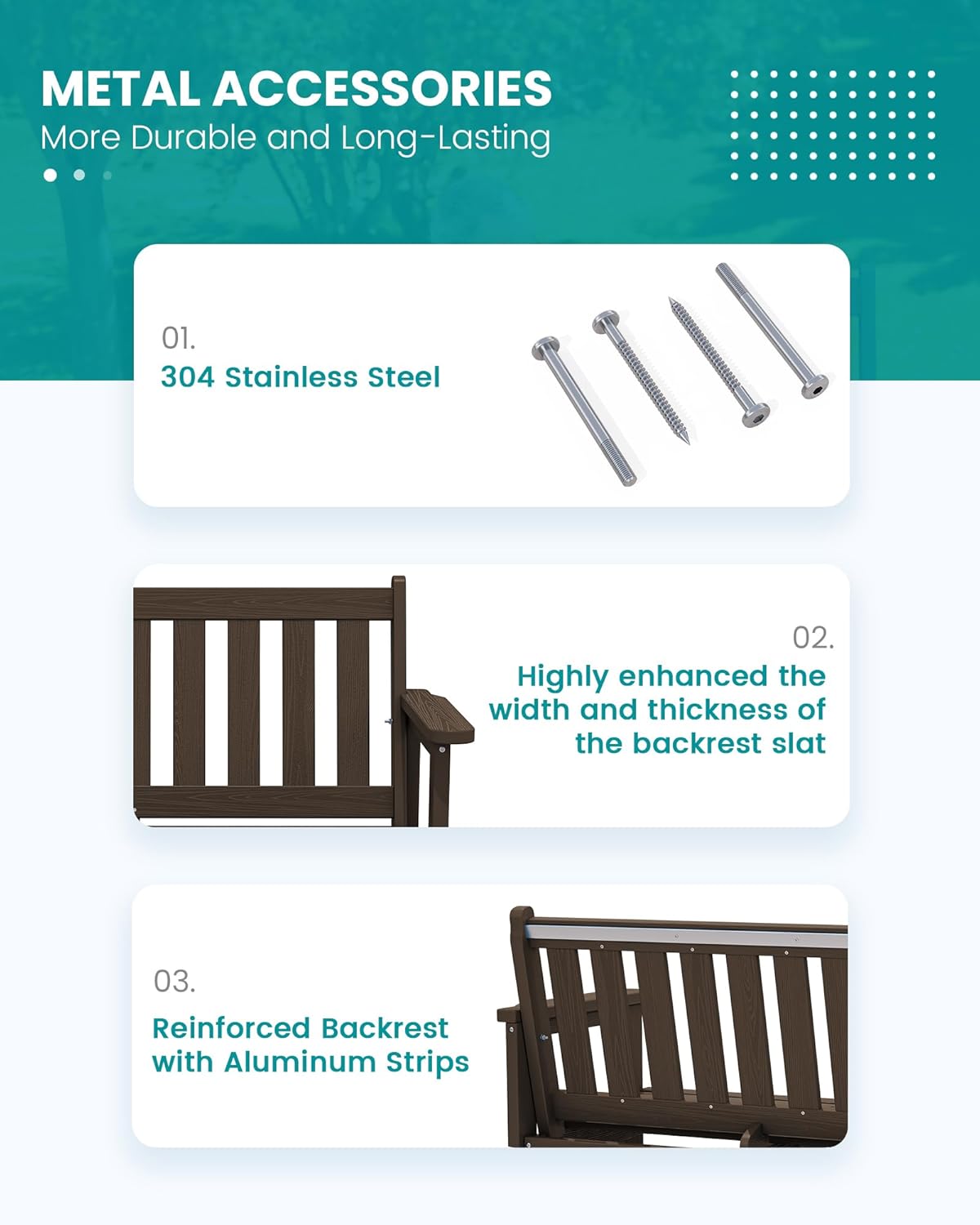 - Reinforced Aluminum Bar: SERWALL garden benches for outdoors are built to last, with sturdy aluminum strips reinforcing the backrest for added durability without compromising comfort. The reinforced chair is more durable and resistant to deformation, ensuring long-term outdoor use.