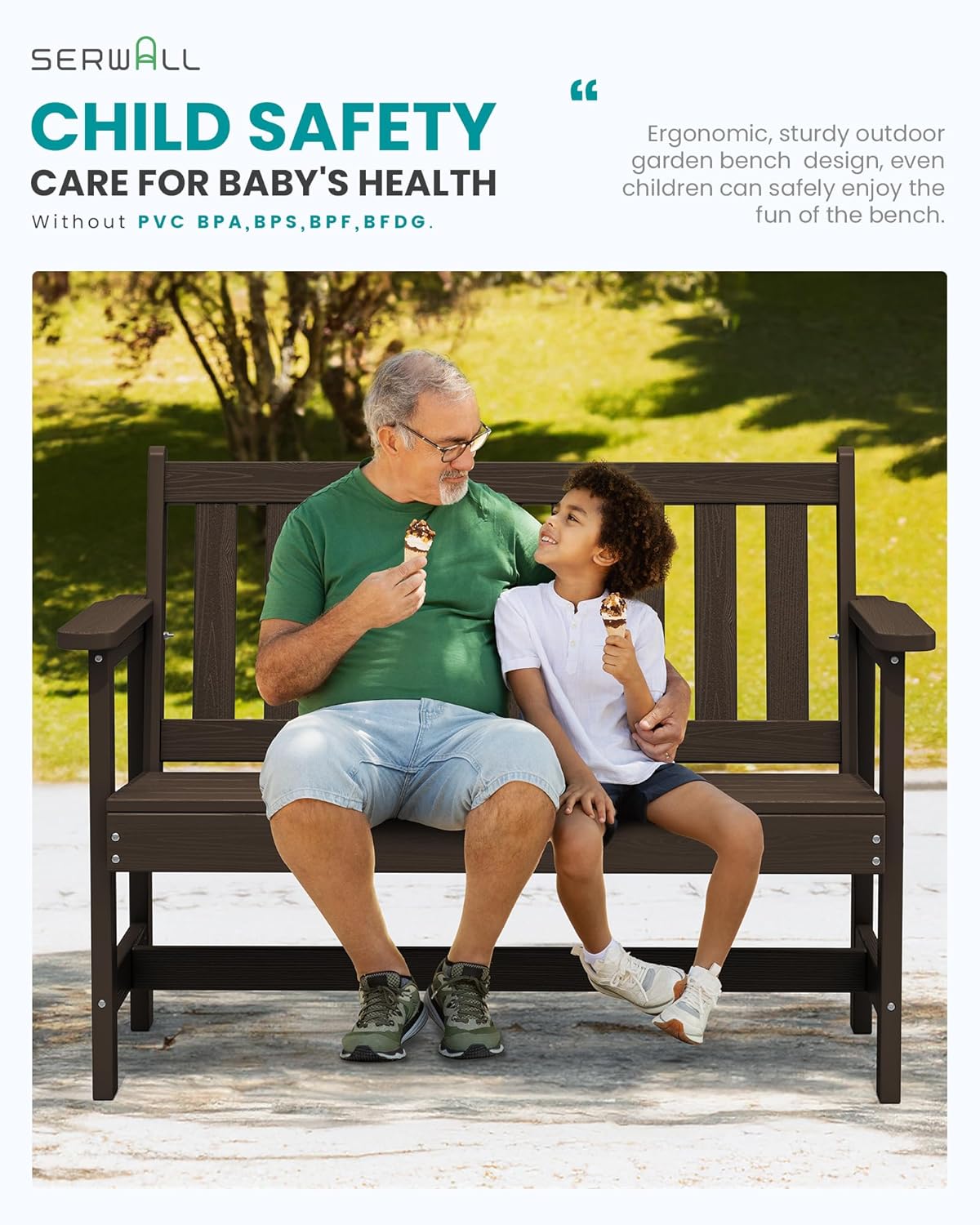 - All-Weather Resistant: The SERWALL garden bench is made of durable high-density polyethylene (HDPE), along with 304 stainless steel hardware, making it resistant to various weather conditions and ensuring long-lasting durability. It is an ideal choice for any outdoor environment.
