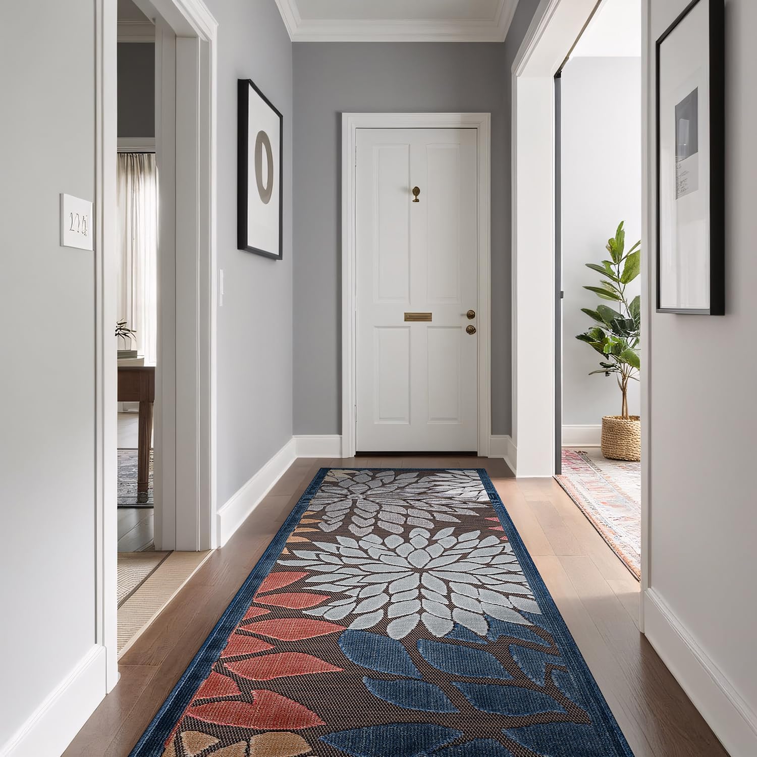 Beverly Rug Outdoor Runner Rug 2x7 Modern Floral Tropical Area Rugs for Indoor and Outdoor Patio Easy to Clean Non Shedding Living Room Porch Garden Washable Outside Carpet (2 x 7 Brown)