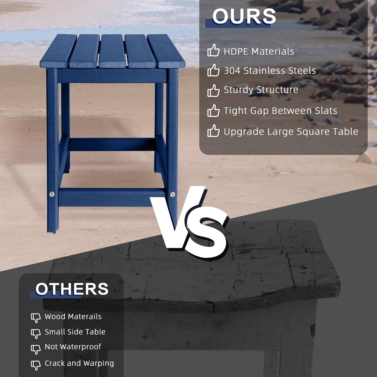 - ăDurable and WaterproofăOur small outdoor side table is made of recycled plastic HDPE. This material prevents warping, dents, rot and fading, perfectly improving the shortcomings of solid wood that is prone to rot, mold, chipping, peeling and cracking. The slat of outdoor end tables design allows for effective drainage, keeping it dry even in wet conditions. The adirondack side table outdoor is rust-proof, durable and has a long service life.