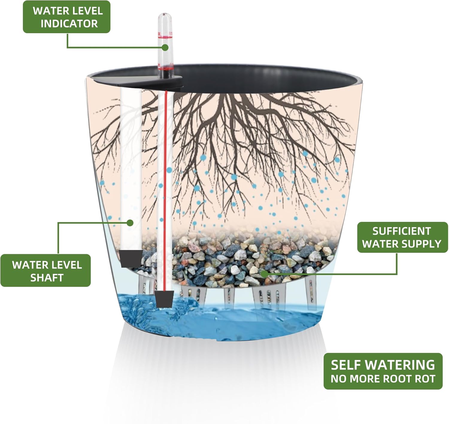 - NEVER MISS WATERING AGAIN - The reservoir between the inner mat and outer pot keeps the water ready, then watering time is at your discretion on the gauge. The design of drainage plug and spillway hole is to avoid cycles of overwatering and underwatering. The sufficient water supply system enables double the water-efficient than conventional pots. Don't be anxious about missing watering while you enjoy a long term holiday on a journey or travel outside