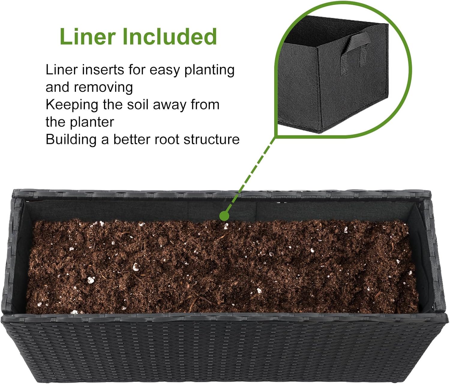 - Removable Liner: Each wicker planter comes with a nonwoven fabric liner (measures 29 x 10 x 10 inch) that separates wicker from the soil. Keep planter in excellent condition to prevent weeds and other invasive species from interfering with plant growth