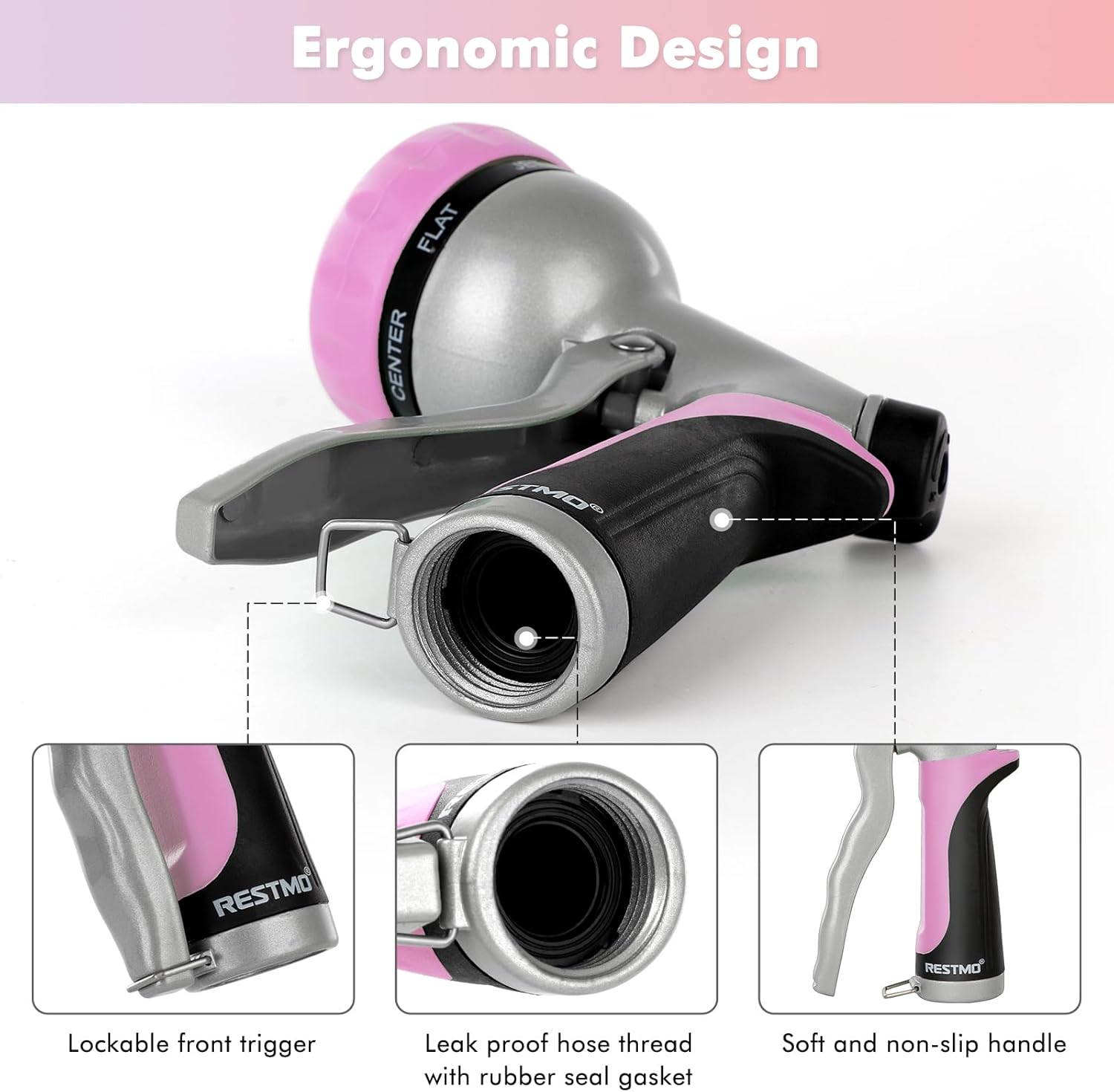 RESTMO Garden Hose Nozzle, Heavy Duty Metal Water Hose Nozzle with 7 Adjustable Spray Patterns, High Pressure Hand Sprayer with Flow Control, Best for Watering Plant & Lawn, Washing Car & Pet, Pink