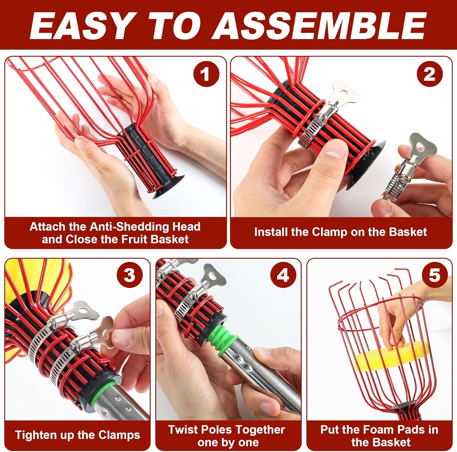 - Easy to Install - First, rotate and tighten the required number of poles, then assemble the fruit basket head and anti-fall head together, and finally rotate the two metal clips to fix the fruit basket on the pole. No additional tools are required, and you can also adjust the length by adding or reducing some poles to meet different height fruit picking needs.