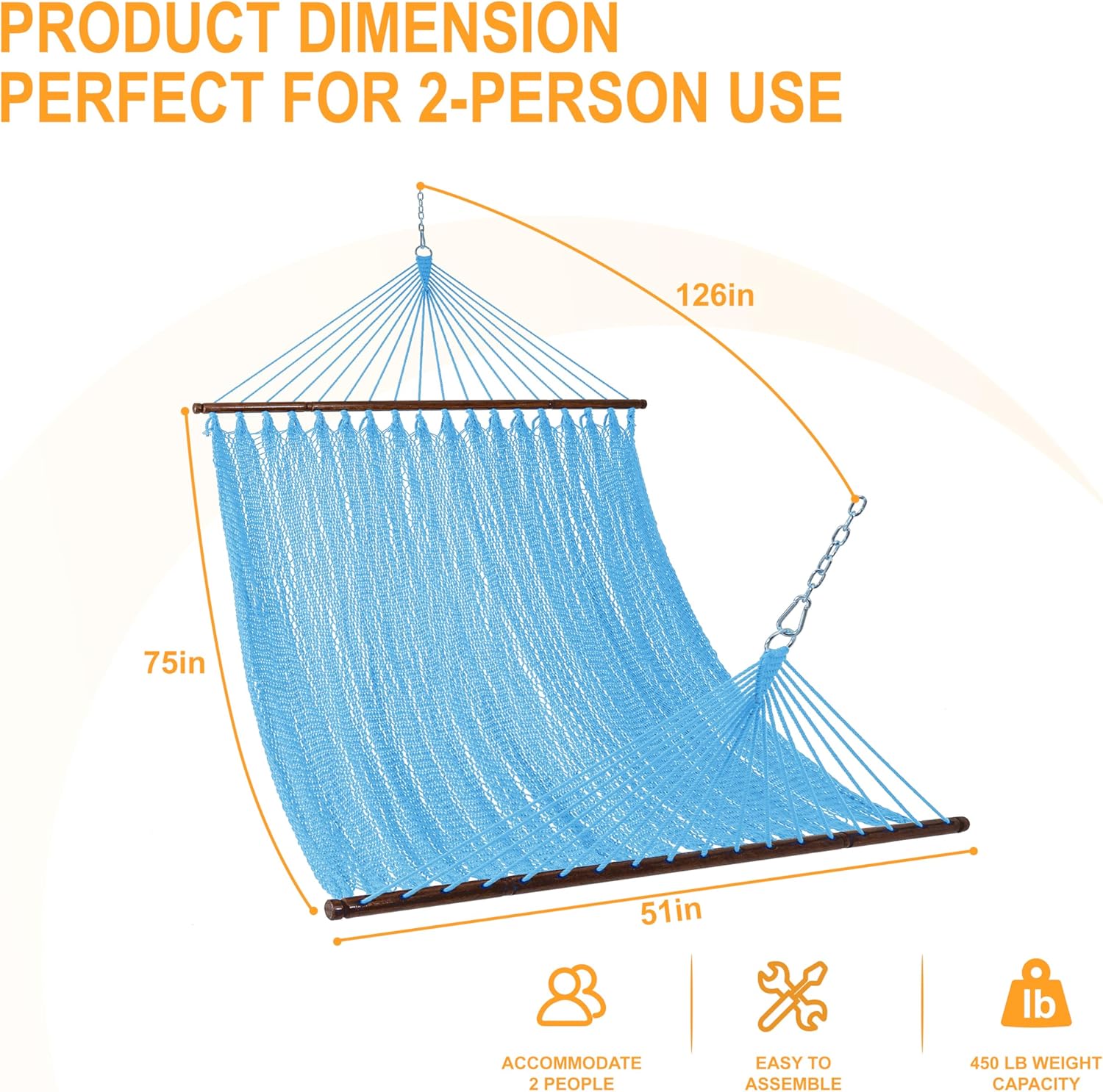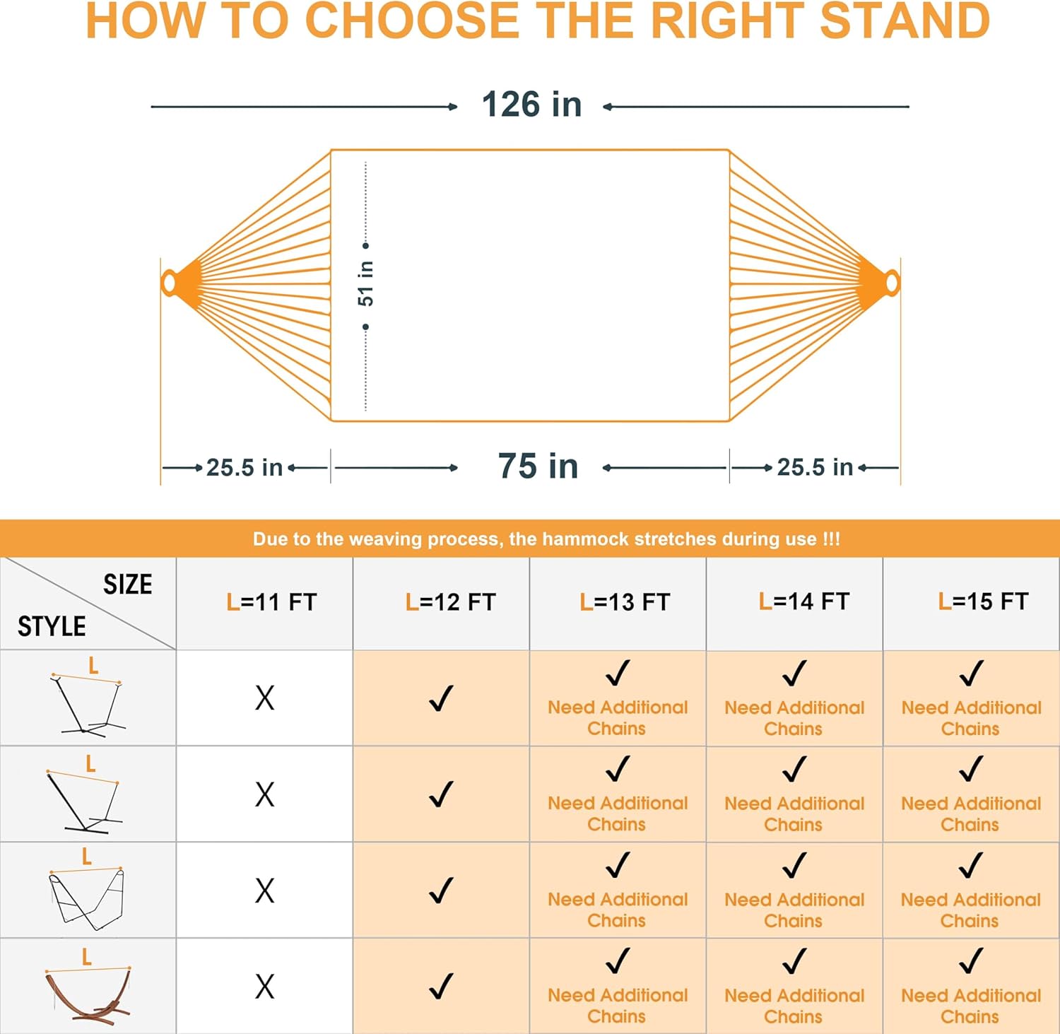 - Adapts to 13-foot hammock stand: The hammock has an overall length of 126 inches and comes with two chains (each link is 7.4 inches long);Due to the way the hammock is woven, it stretches when in use,so a 13-foot hammock stand is required