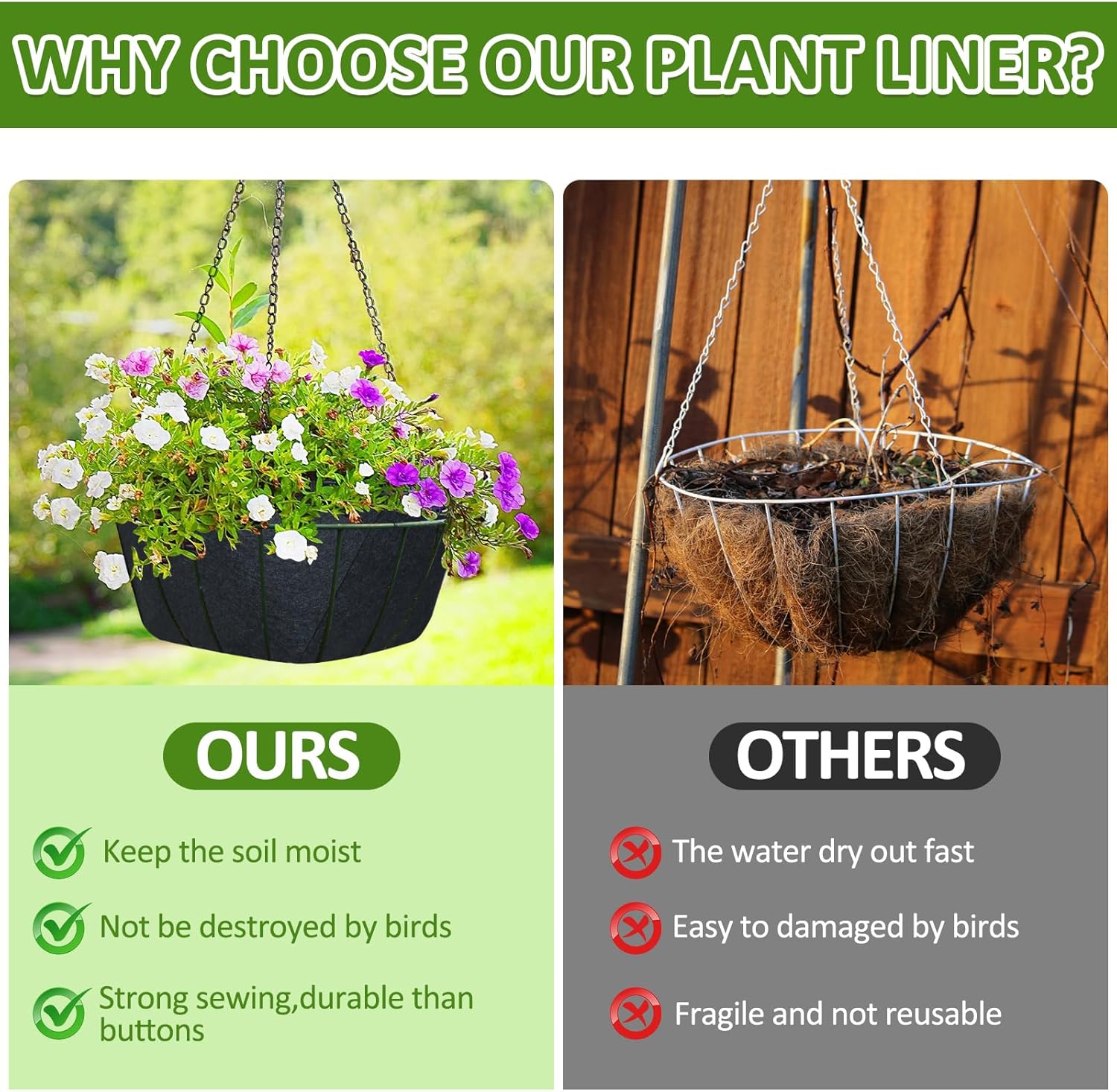 - [Easy to Use]: Simple to install in your hanging baskets, Suitable liners can be selected according to the size of the basket .these fabric liners help maintain the soil and moisture, promoting healthy plant growth.