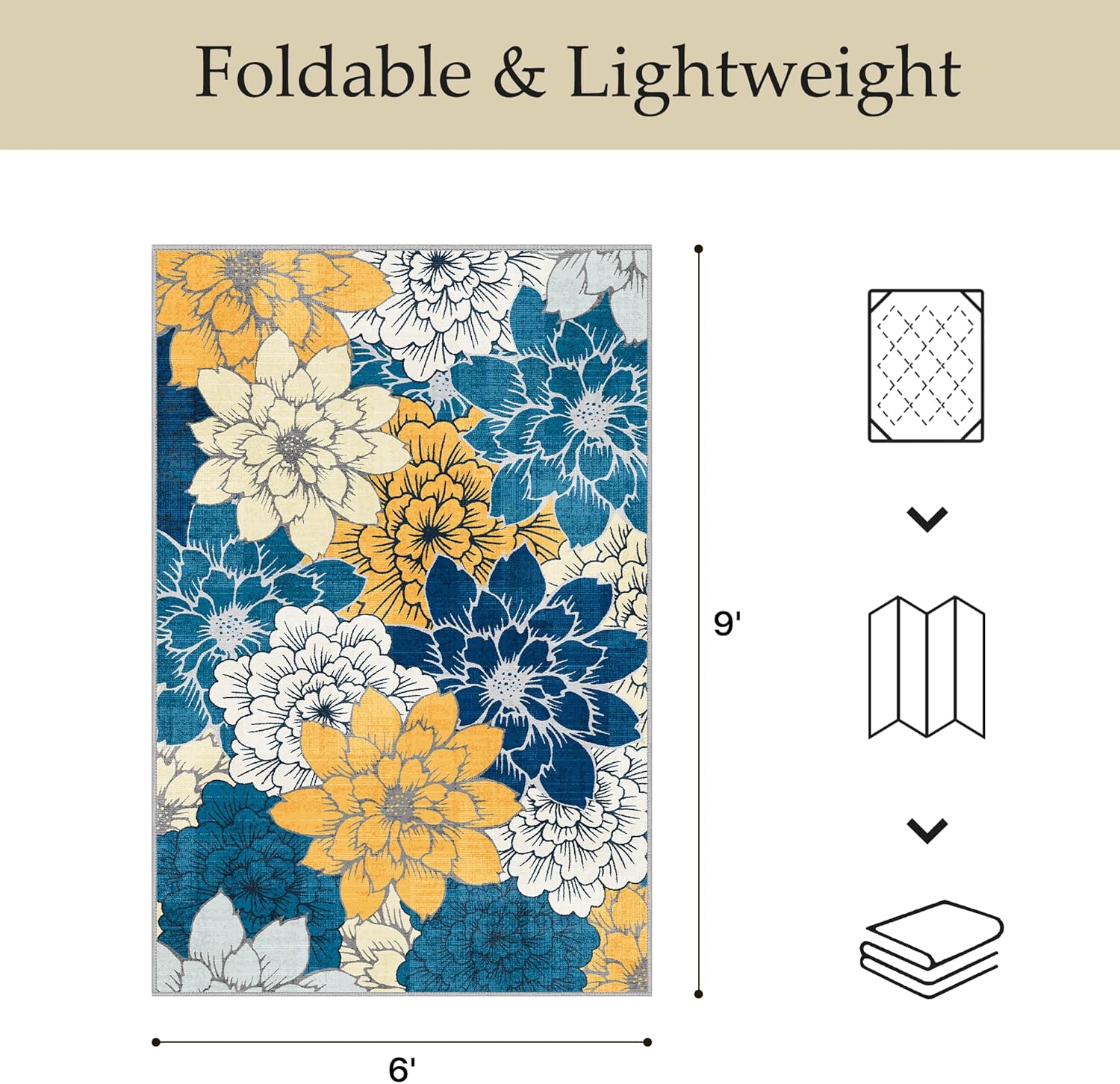 GENIMO Indoor Outdoor Area Rug 6' X 9' Waterproof, Washable Patio Rug Non Shedding, Easy Cleaning Floral Outdoor Carpet for Living Room, Bedroom, Dining Room, Balcony, Backyard, Deck, RV, Blue