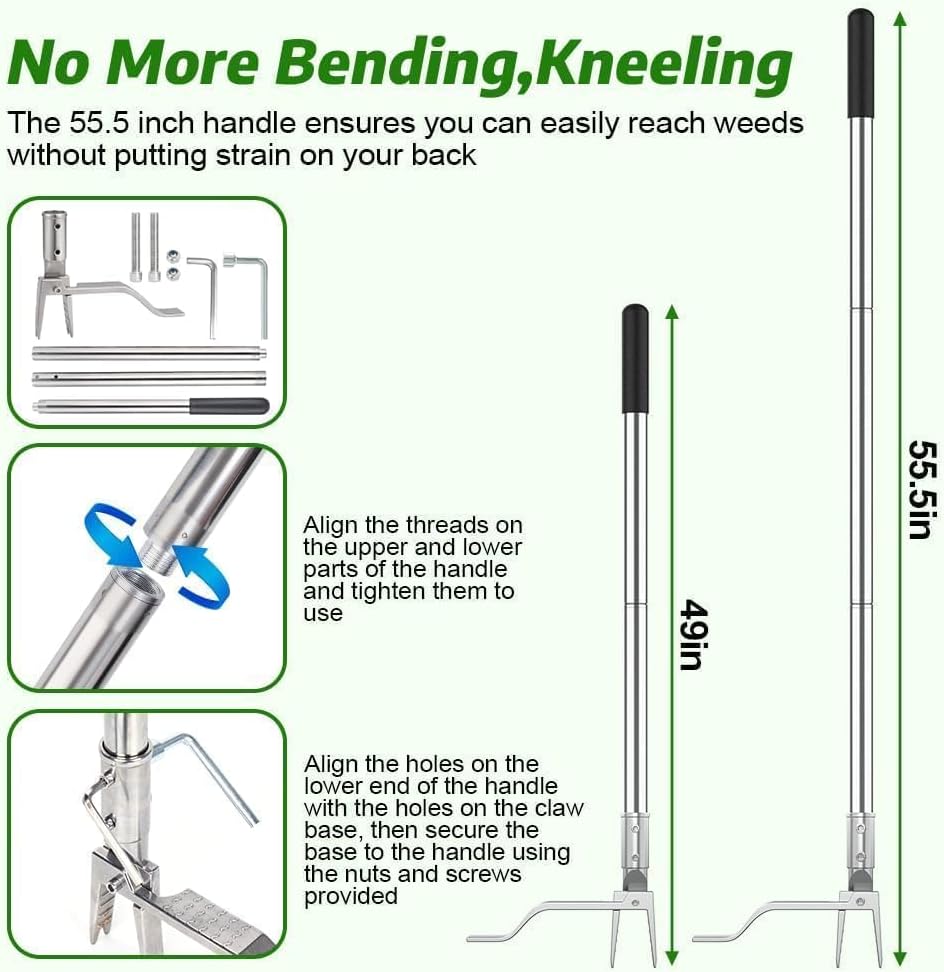 - 55.5 Inch Ergonomic Handle: The 55 inch weed puller tool stand up heavy duty is designed for users with back/joint issues, the handle consists of 3 parts and is adjustable in size 49"/55" to match your height and reduce pressure, allowing you to stand while weeding. The lightweight and sturdy structure reduces pressure on the joints, making it ideal for users with sensitive backs or mobility issues