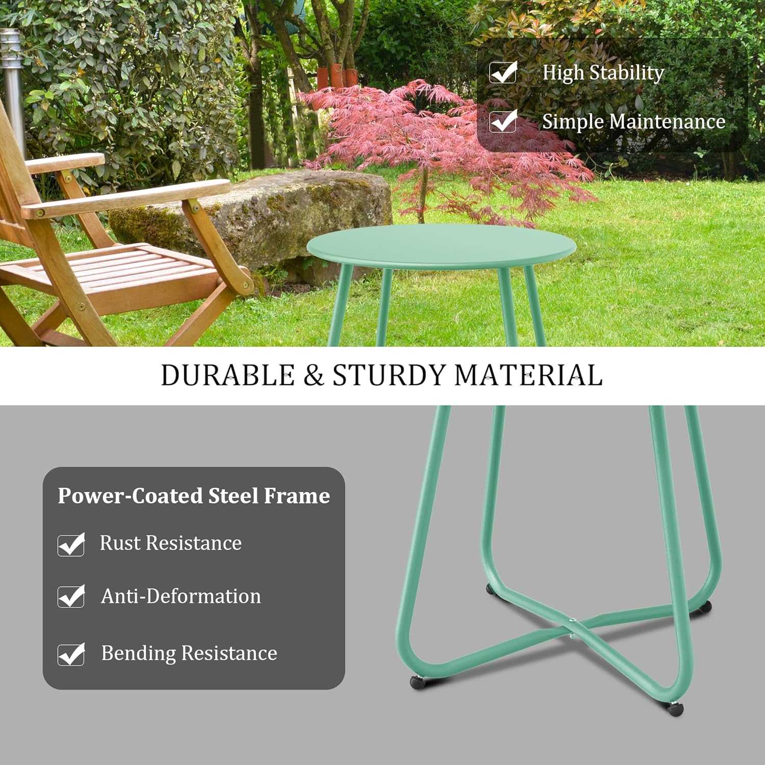 - Durability: Our small round table features an electrophoresis and powder coating technology that creates a glossy surface with anti-rust properties. Whether under the sun or in rainy conditions, this outdoor side table is built to endure. The powder coating is weather-resistant, waterproof, and won’t peel off. Additionally, it is scratch-resistant and UV-resistant, making it perfect for use in your yard or on your balcony.