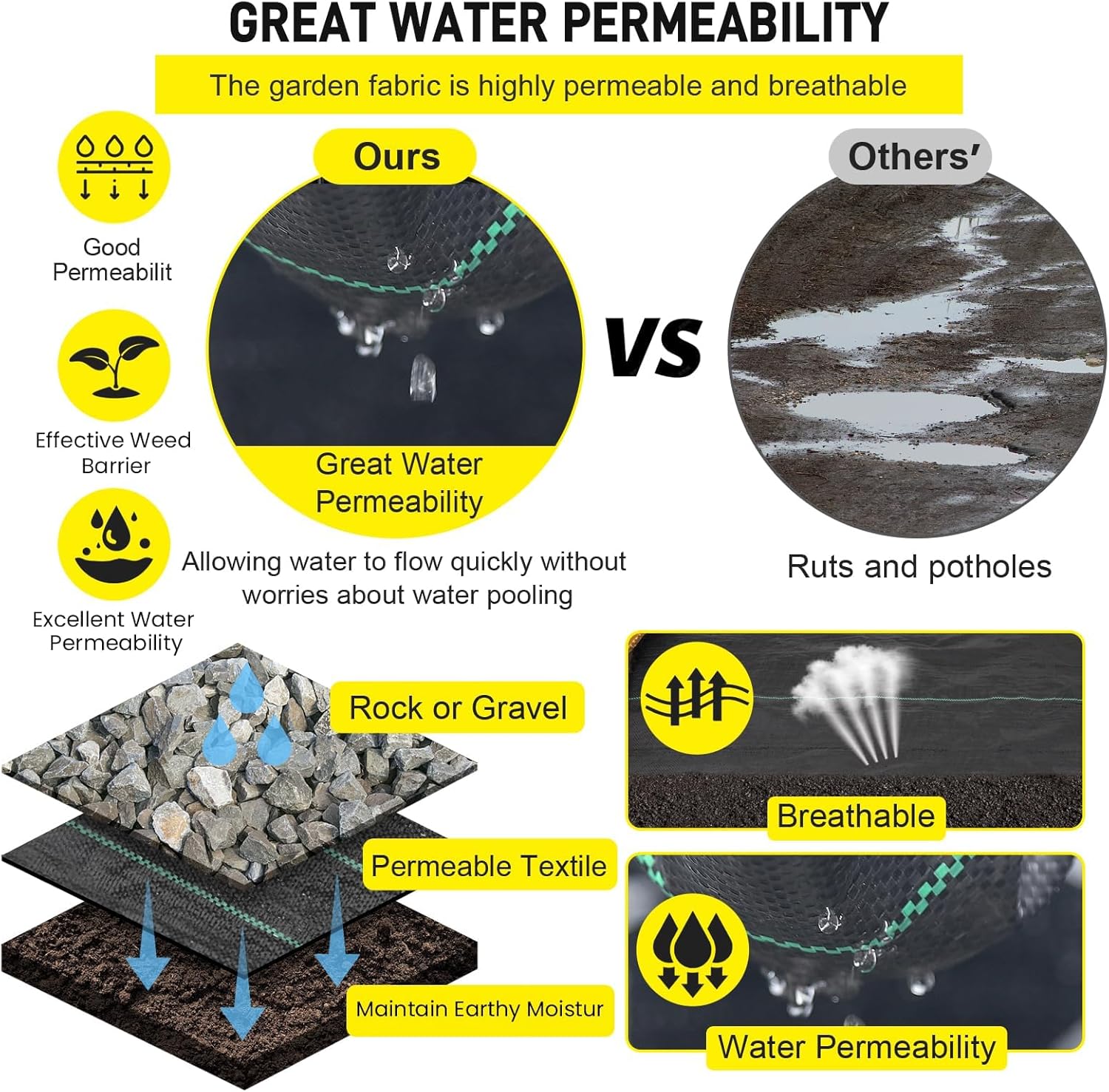 - 【Excellent Water Permeability】-This Landscape Fabric with great water permeability allows water and air to pass through it easily without washing away the soil, thus having excellent permeability to conserve soil moisture, improve soil quality and maintain the stability of the soil.