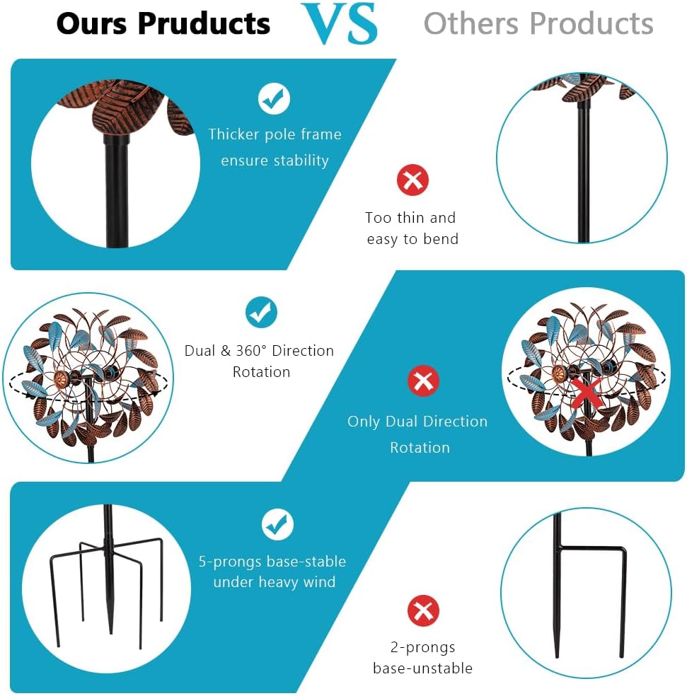 - 【High Quality Spinners】VEWOSTAR's wind spinners outdoor can rotate 360°,and the sealing bearings of windmill are upgraded with fine welding technology, which can prevent rainwater infiltration and enable metal wind spinner to rotate smoothly in the wind.