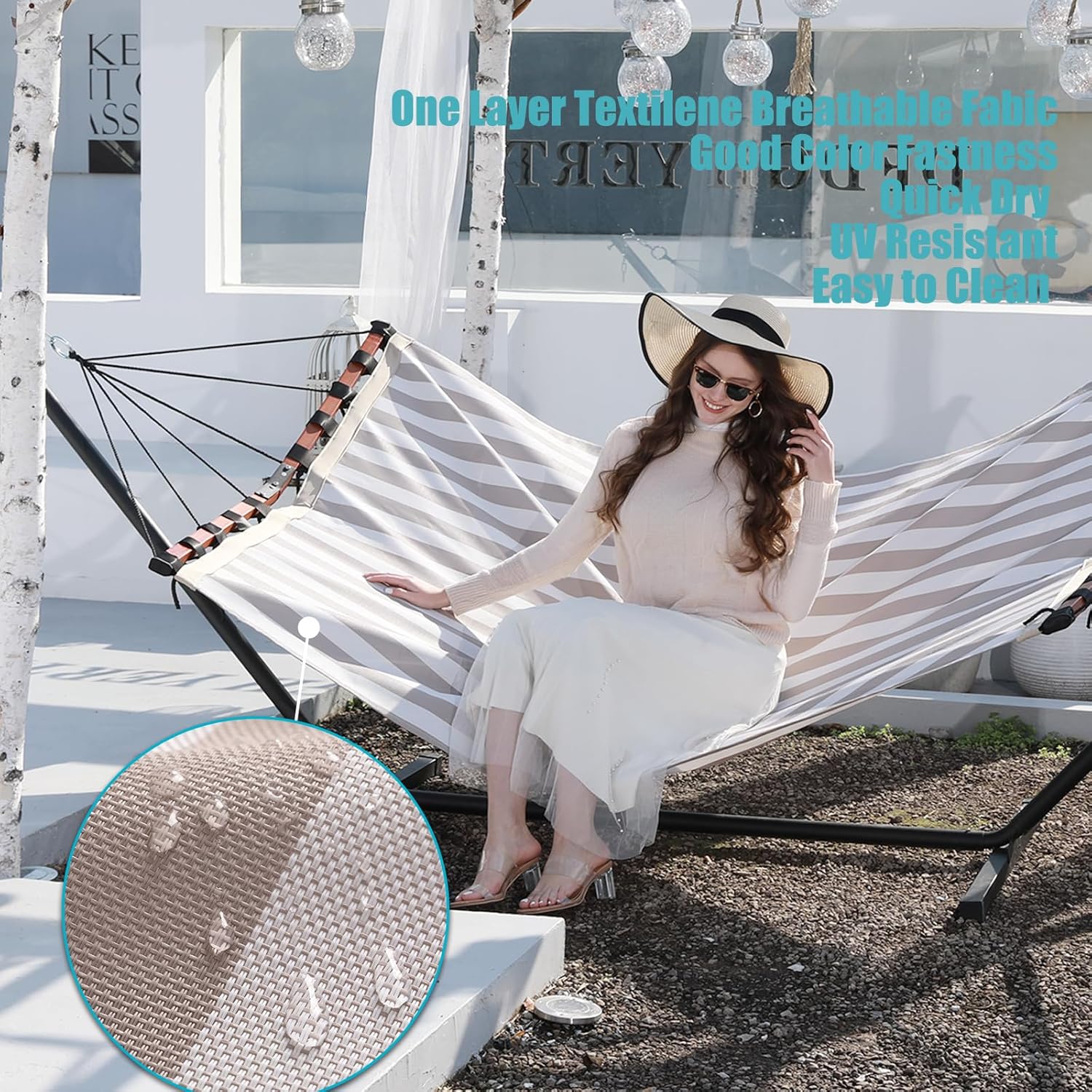TegerDeger 12FT 2 Person Hammock Large Hammock Quick Dry 450LB Capacity with V Shaped Hardwood Spreader Bar & Nylon Rope for Outside, Patio, Garden, Backyard, Beach, Poolside - Beige Stripes