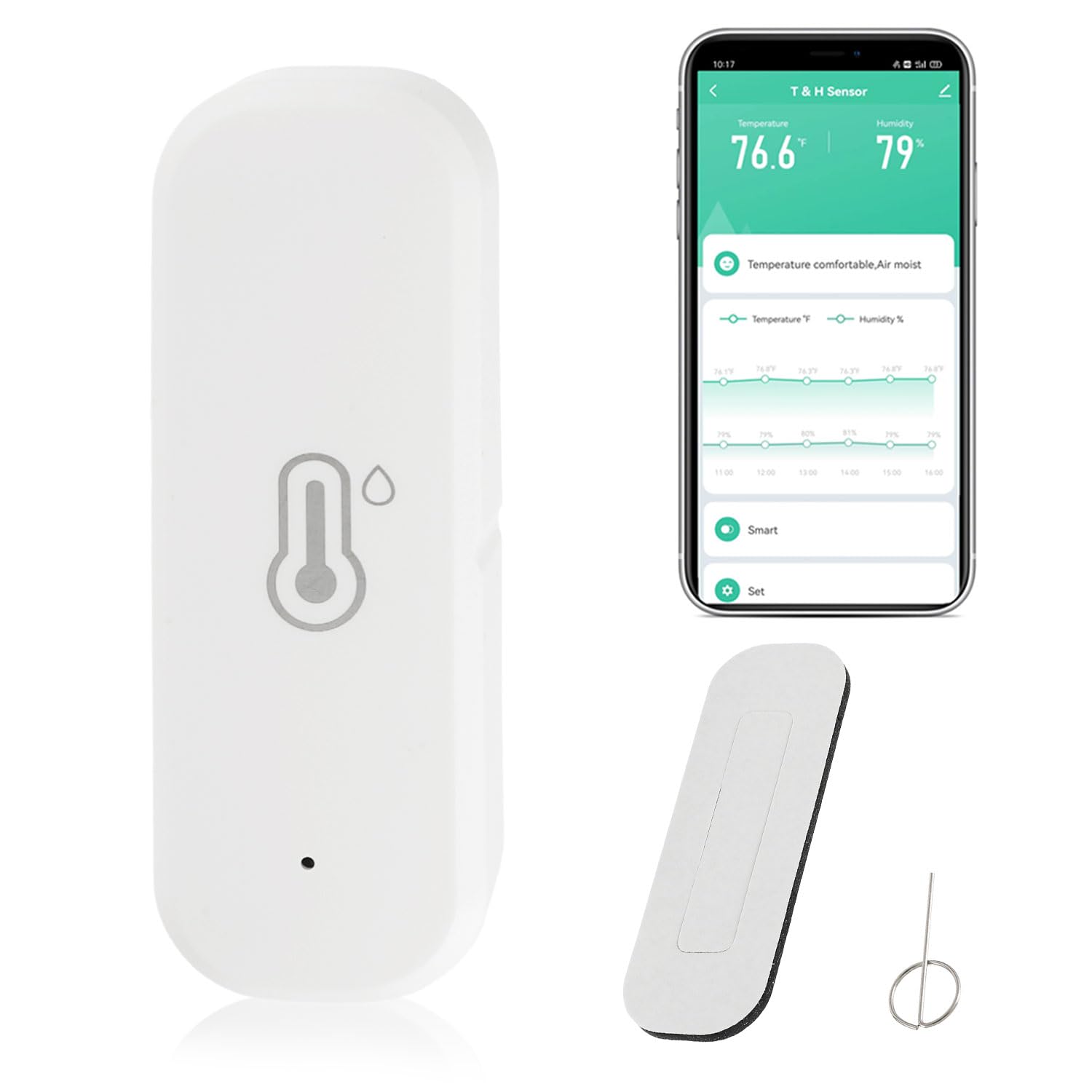 - Easy to use: No need to worry about complicated operations, in 2 minutes or less you can start experiencing the intelligent life! The intelligent temperature humidity sensor supports remote monitoring, free app alerts, °F/°C readings, display history, and temperature and humidity graph functions. Ideal for use with your humidifier/dehumidifier/air conditioner